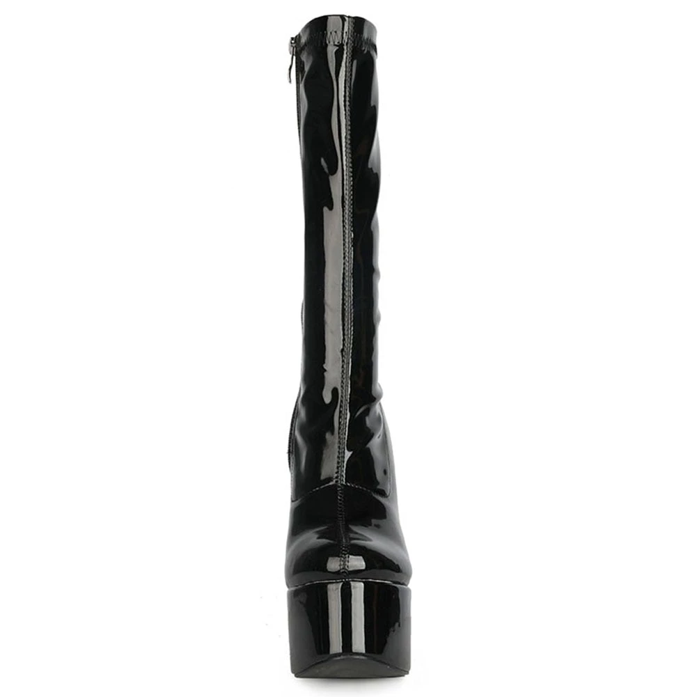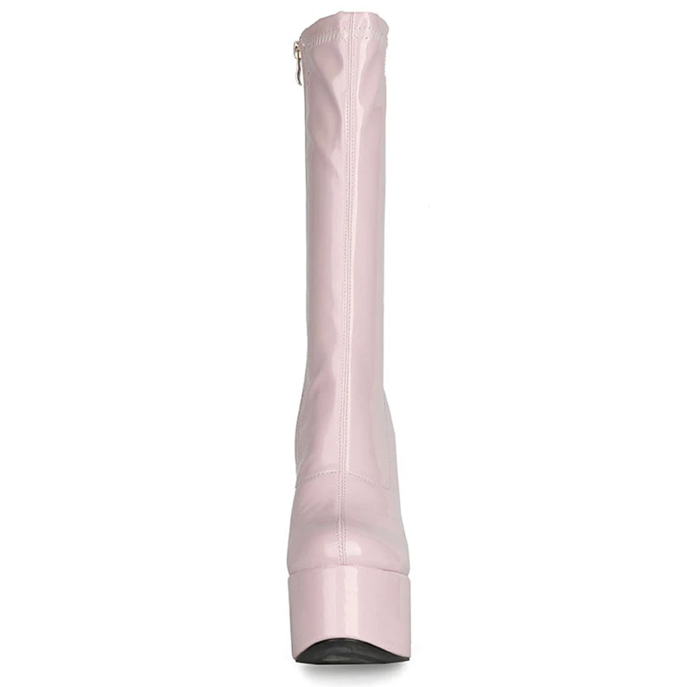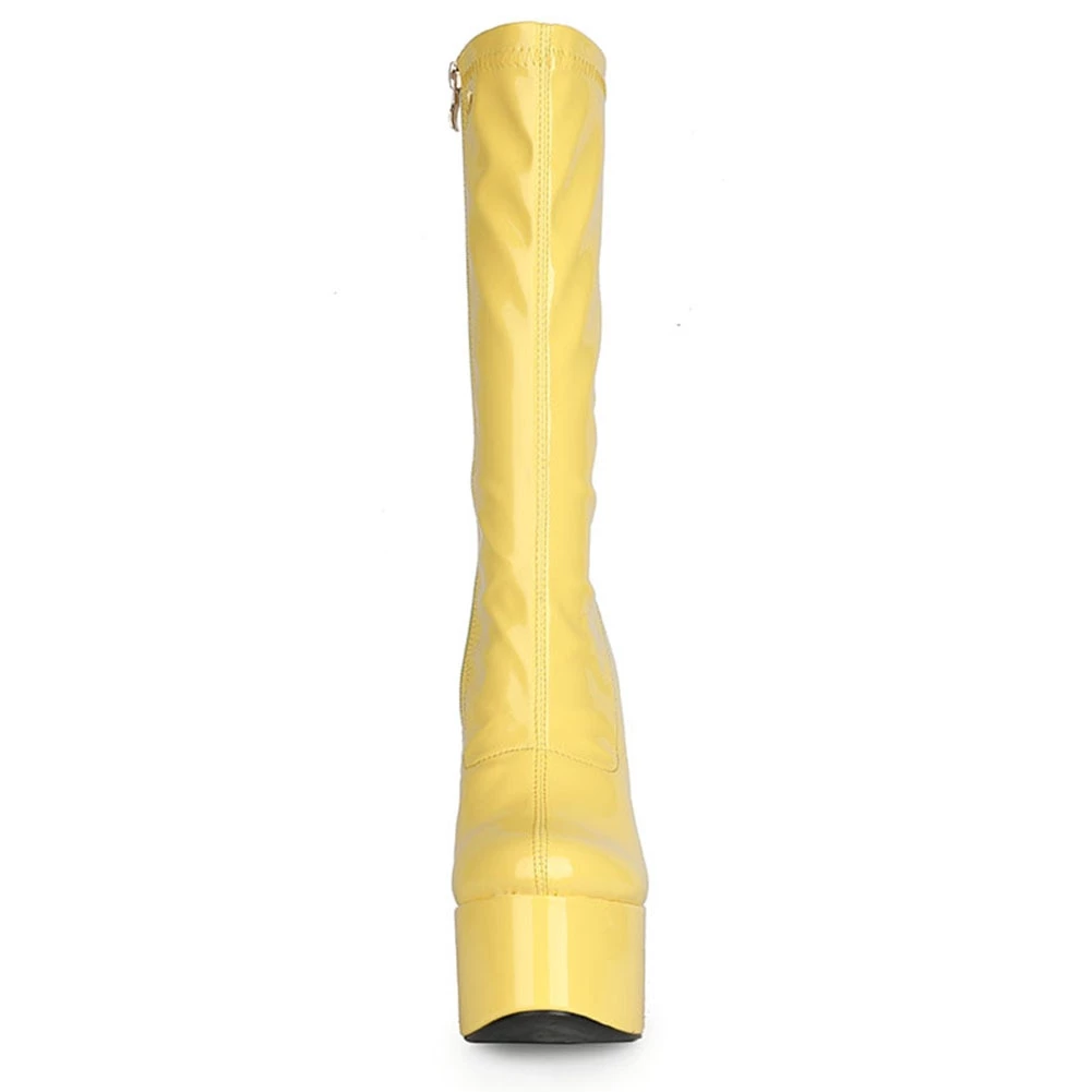 Retro-style patent coloured mid-calf platform heeled boots. Zip fastening.