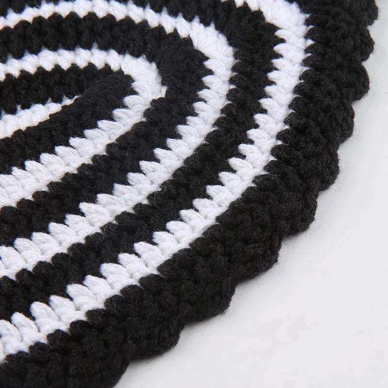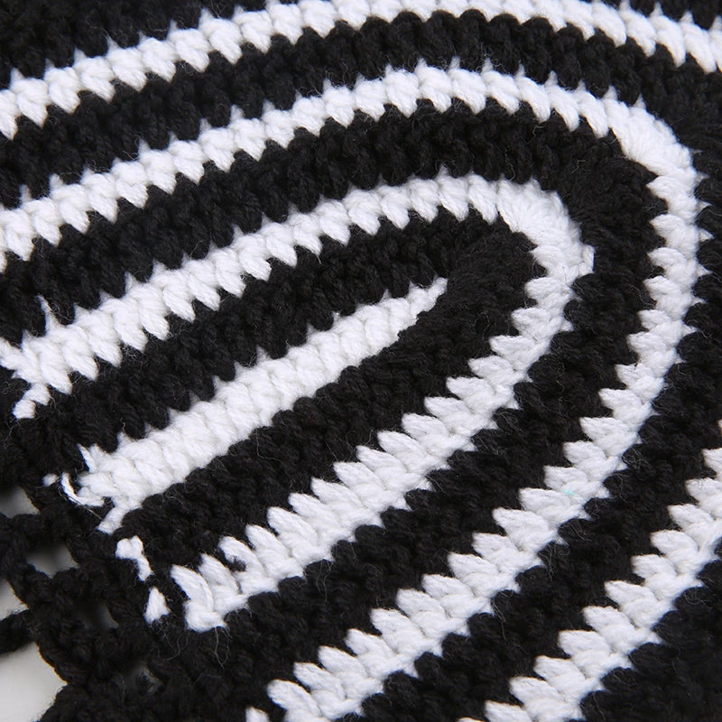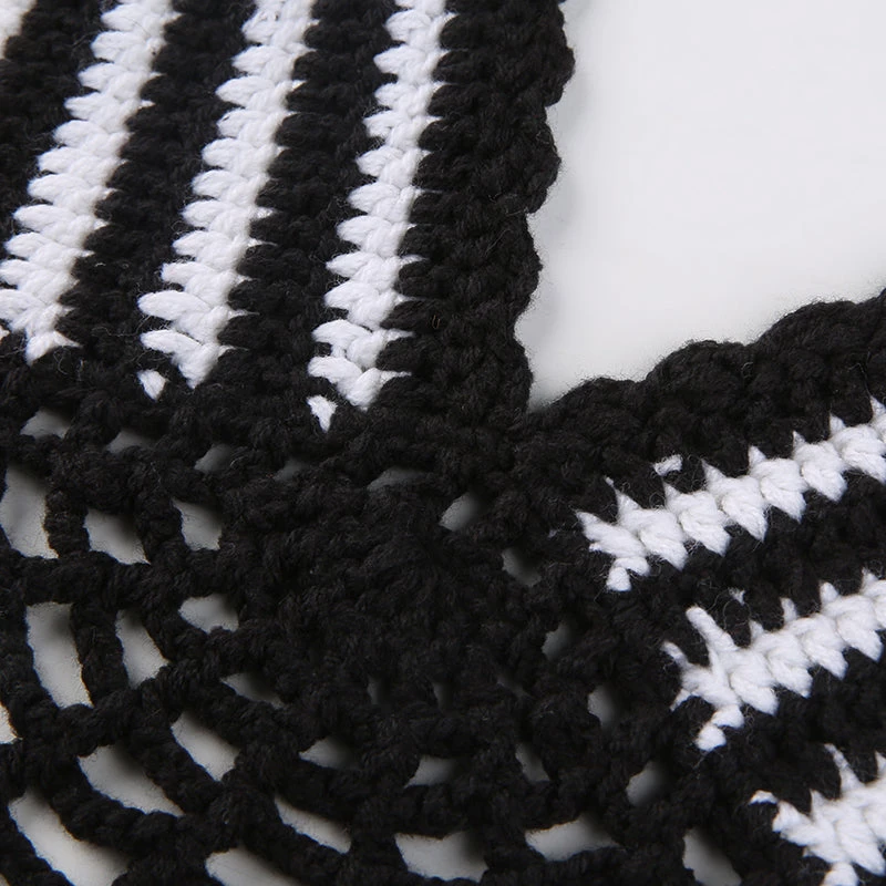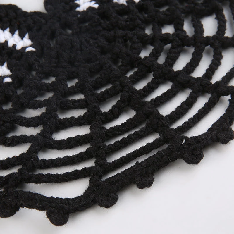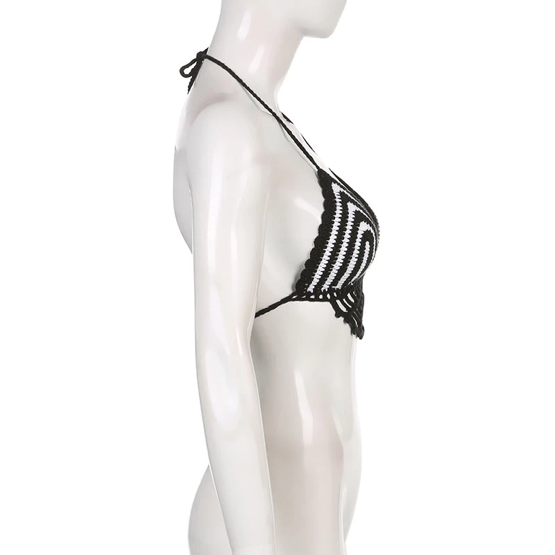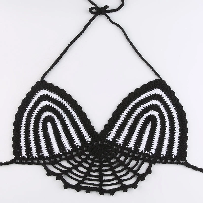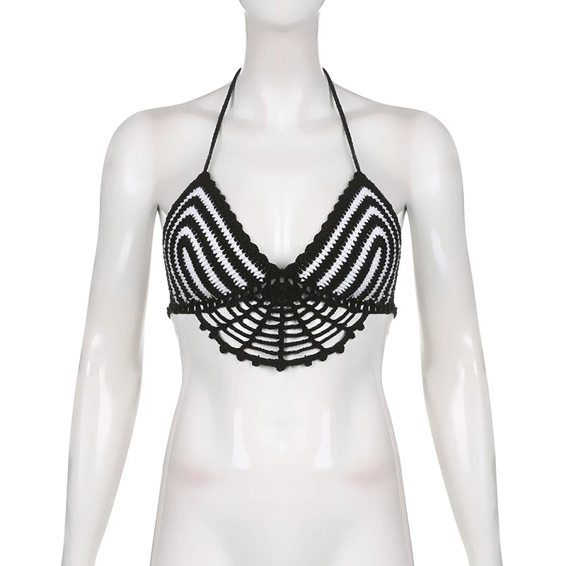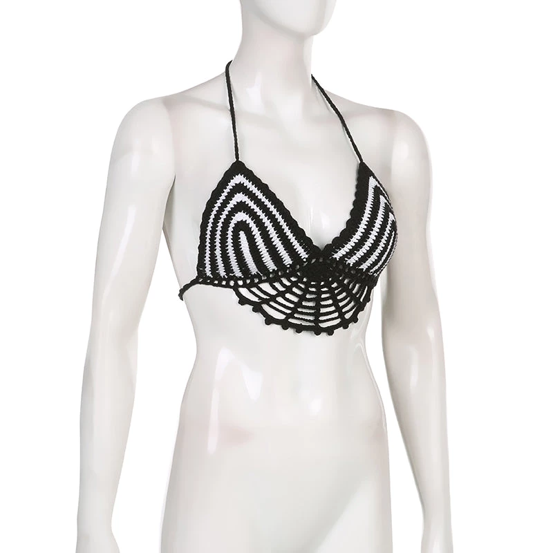 Black and white crochet web-style halter crop top.