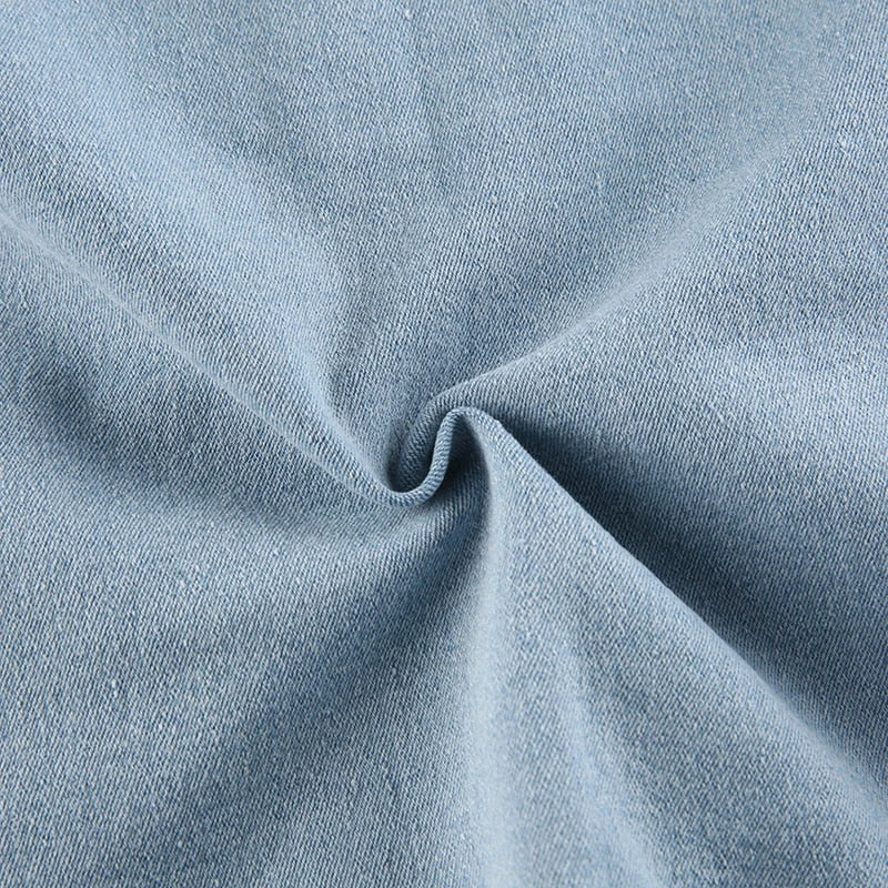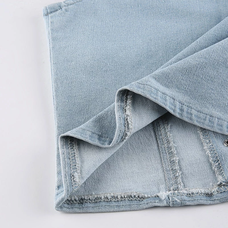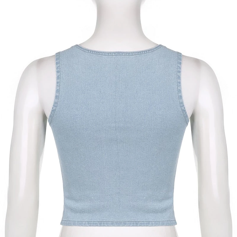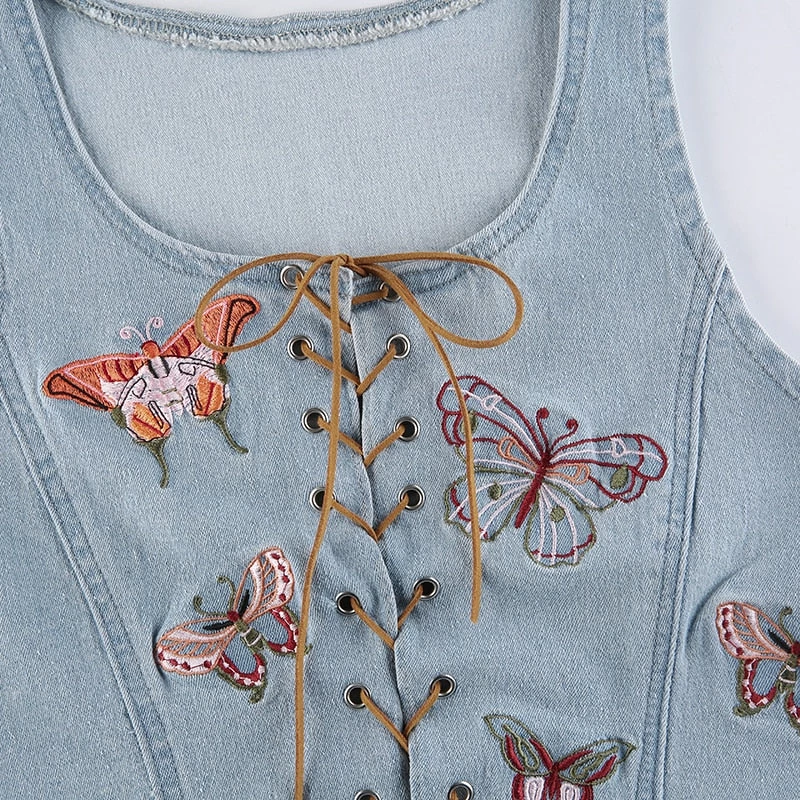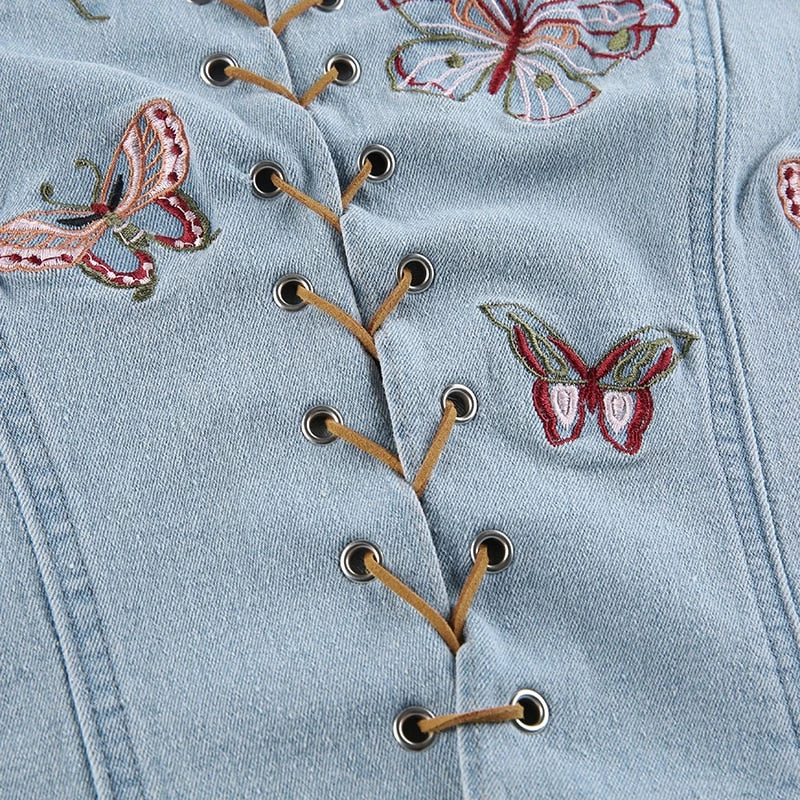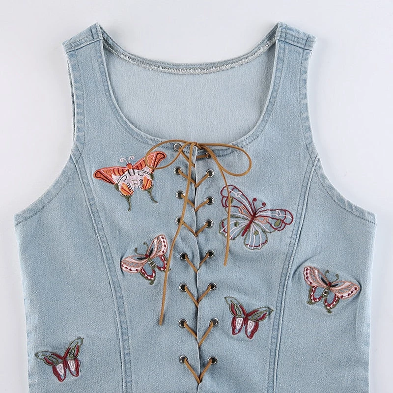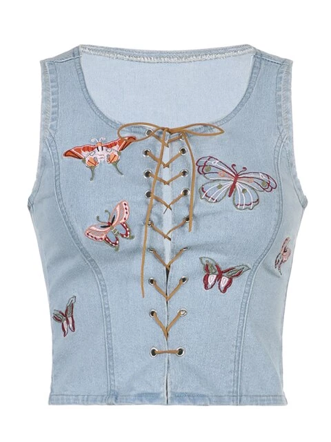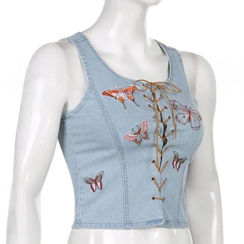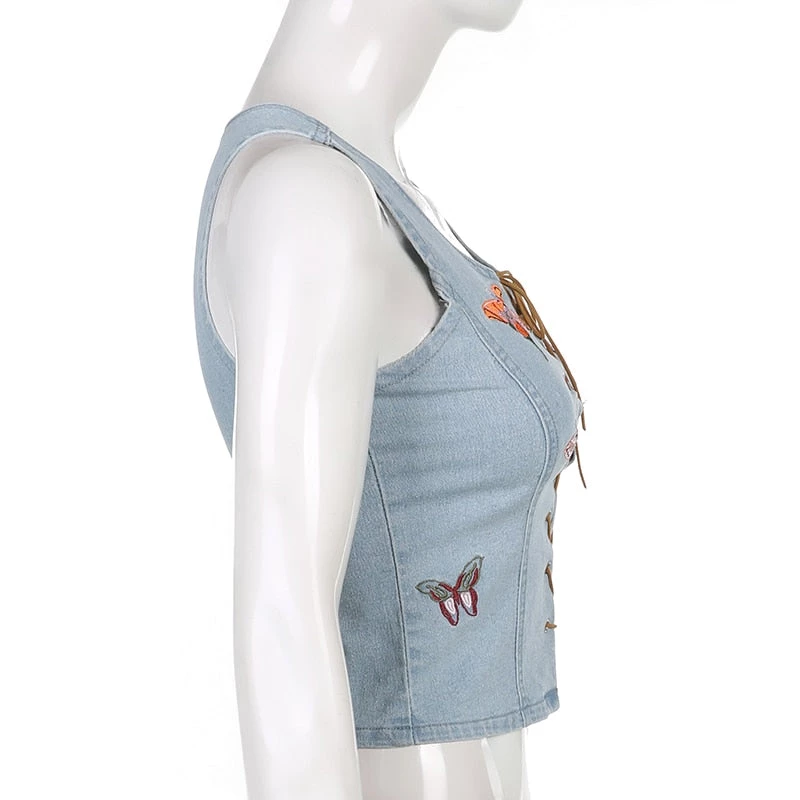 Light blue denim-look tie up tank crop top with a butterfly embroidery design.