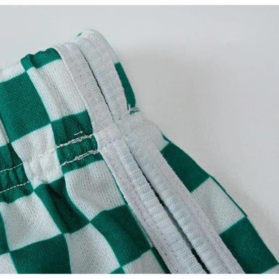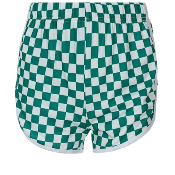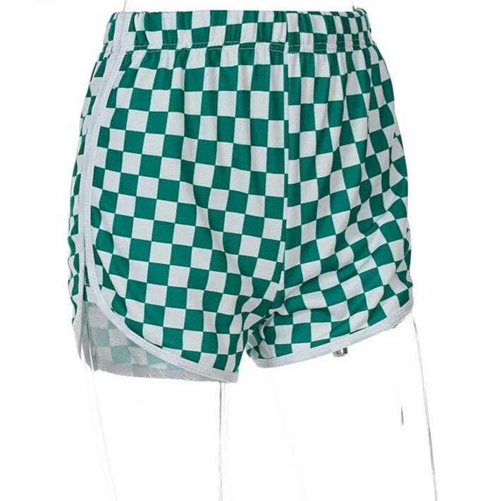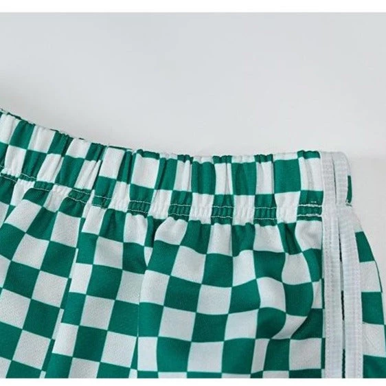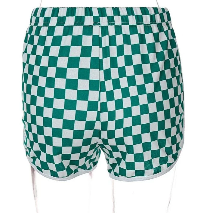Green and white checkerboard casual shorts.