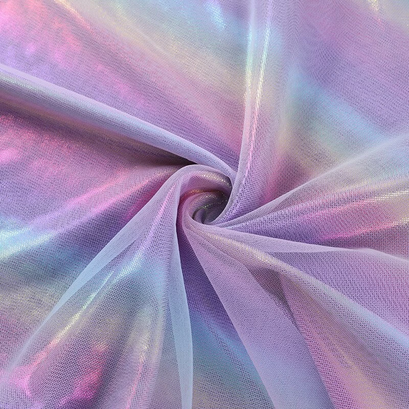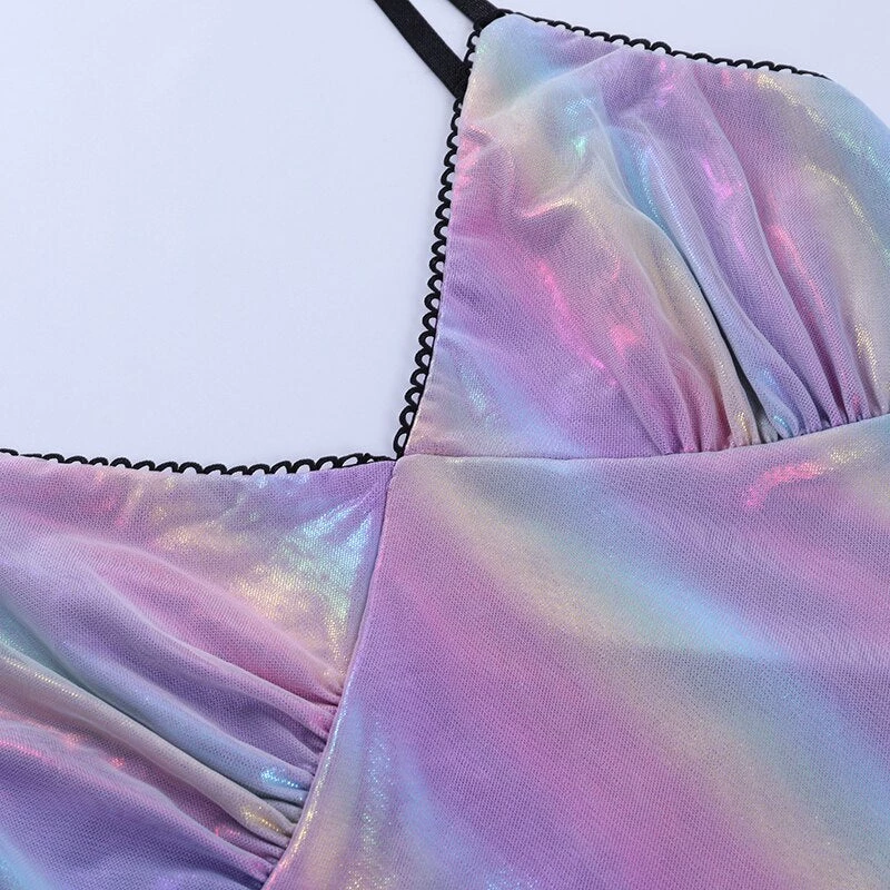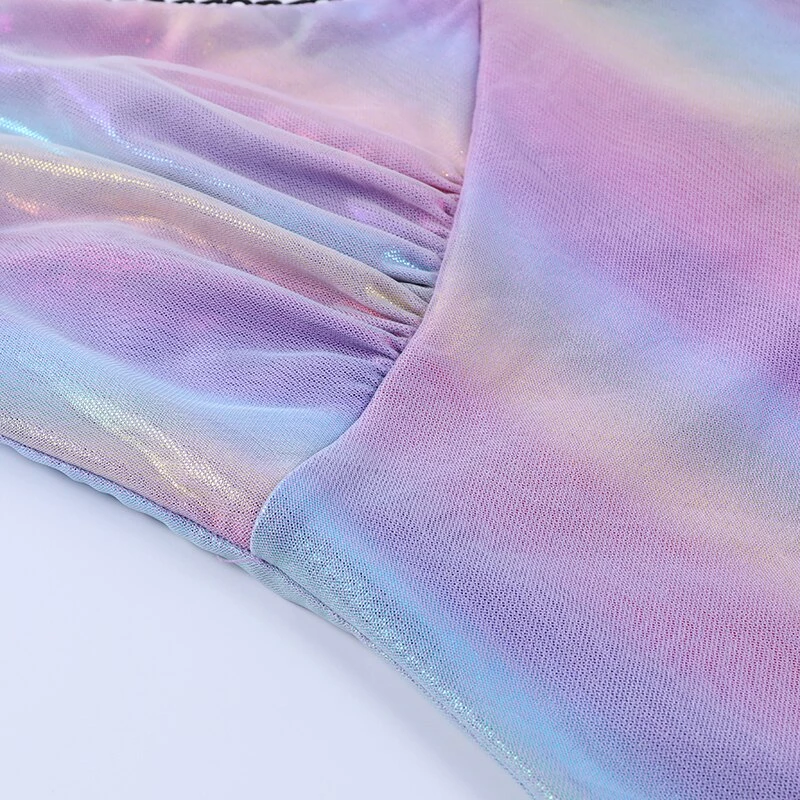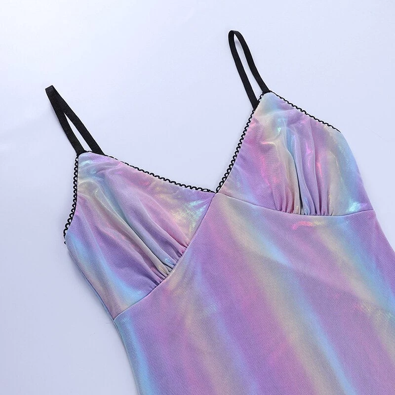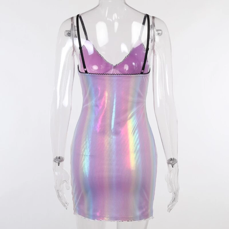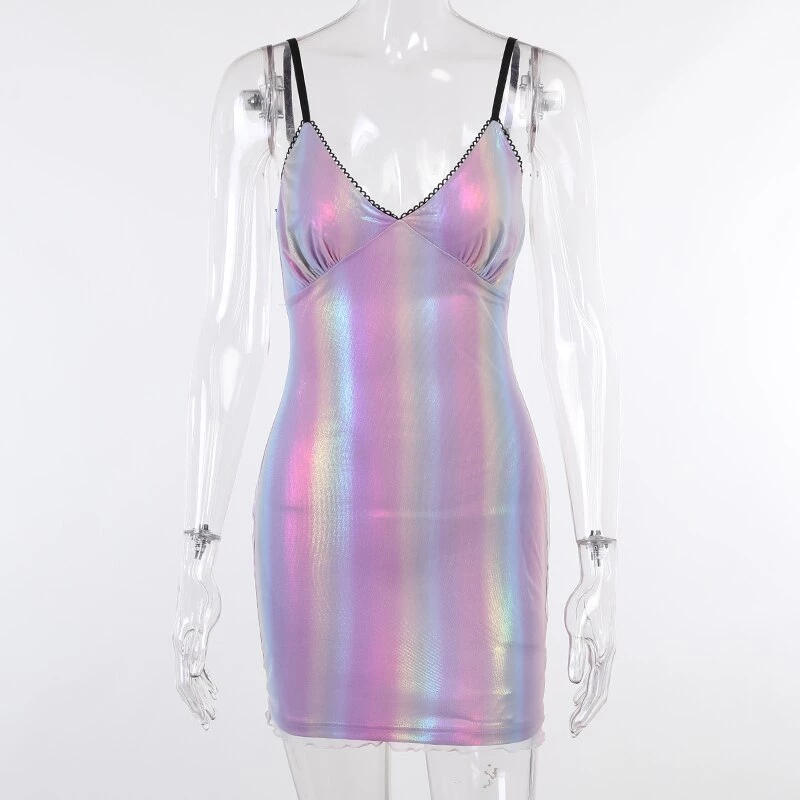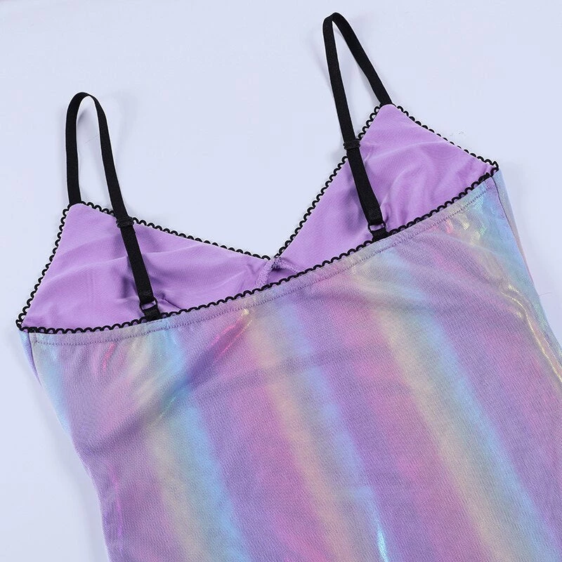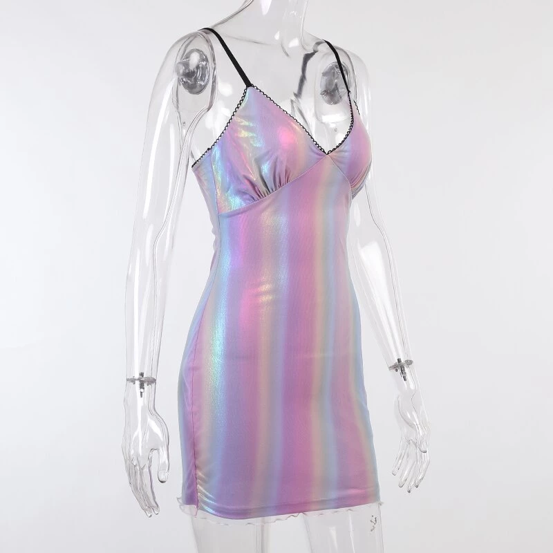 Purple-toned iridescent rainbow mini dress.