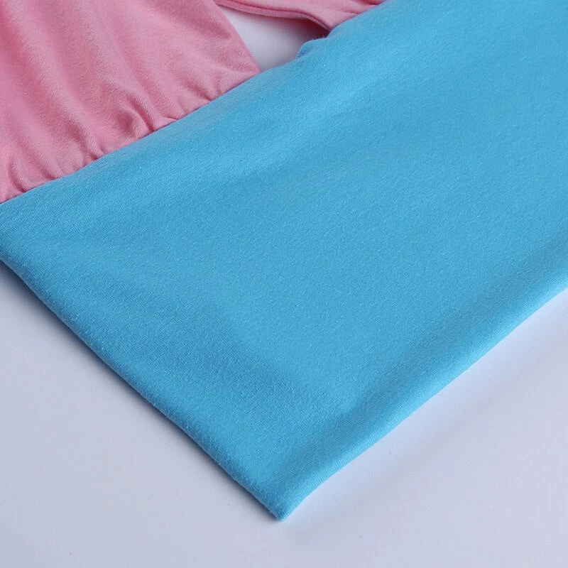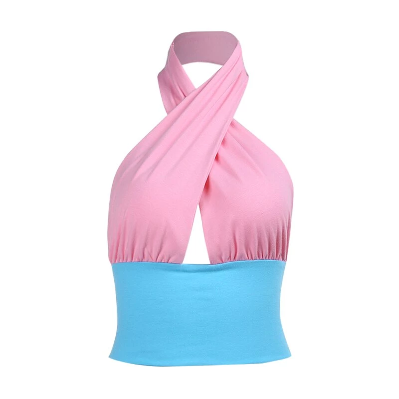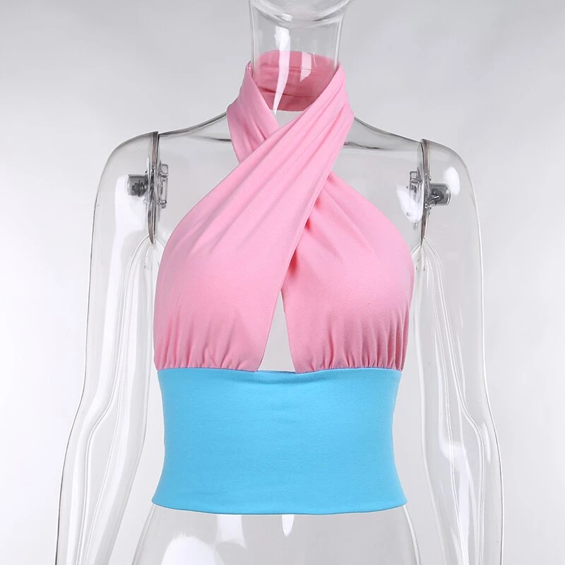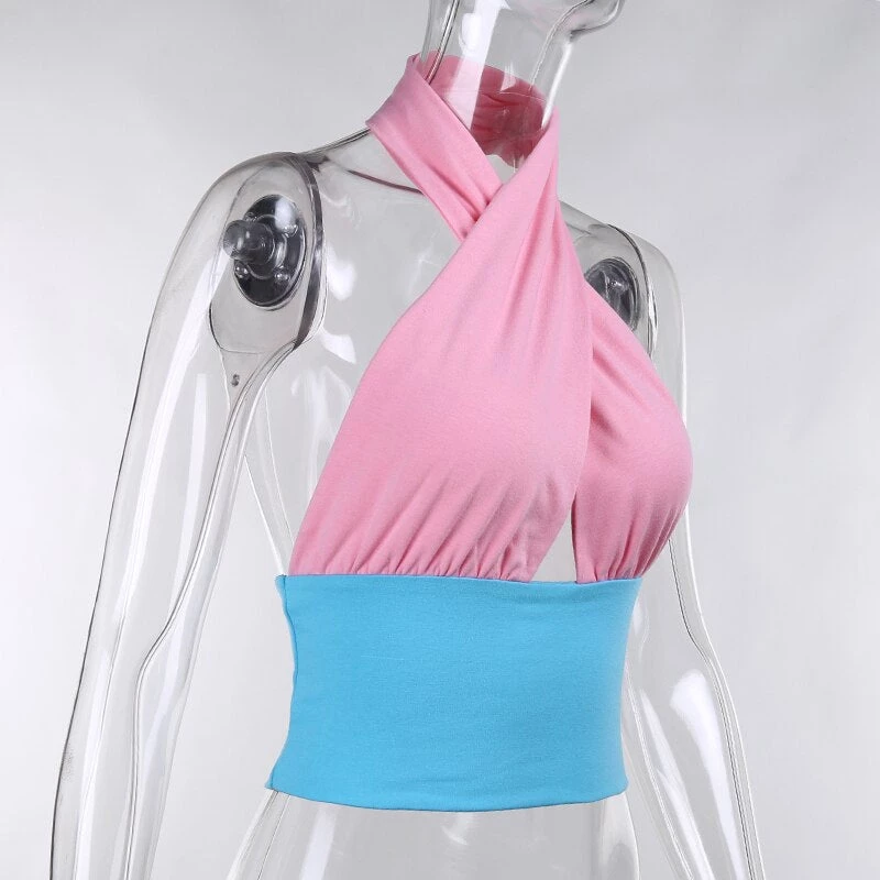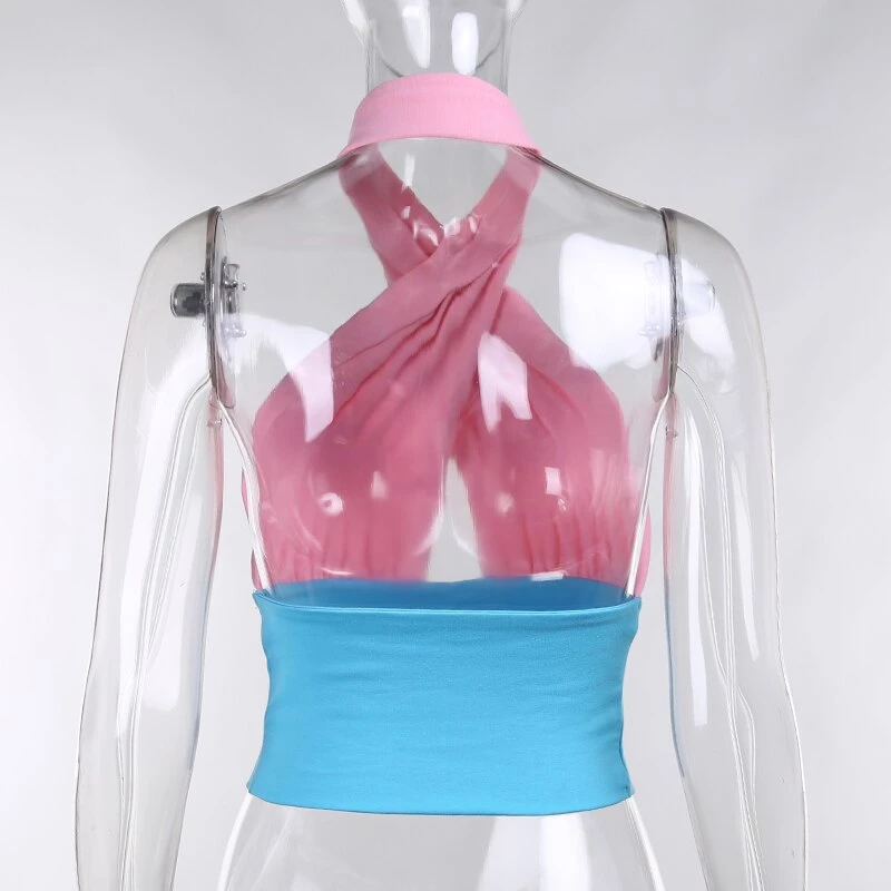 Blue and pink halter neck backless crop top.