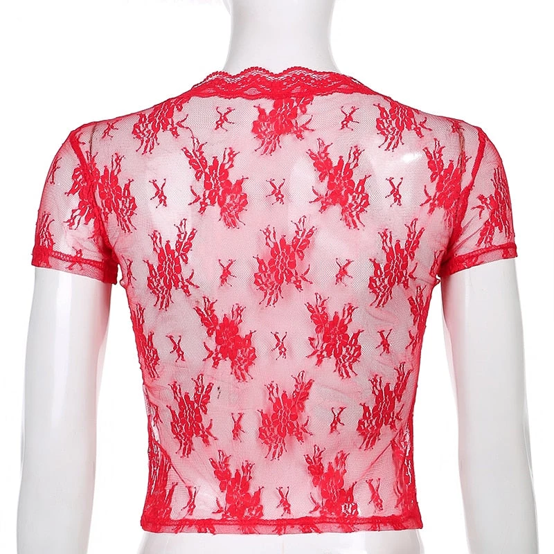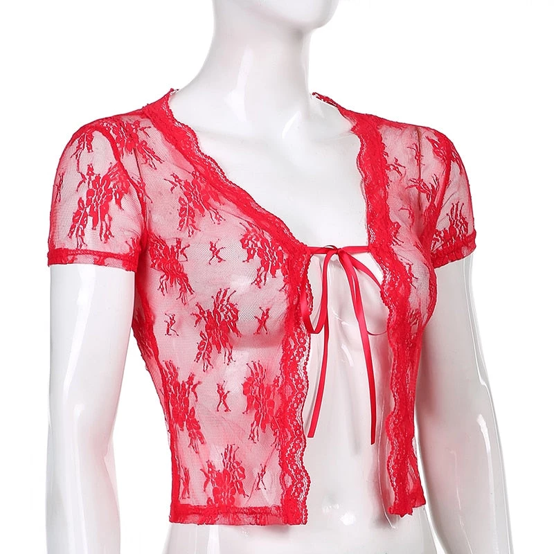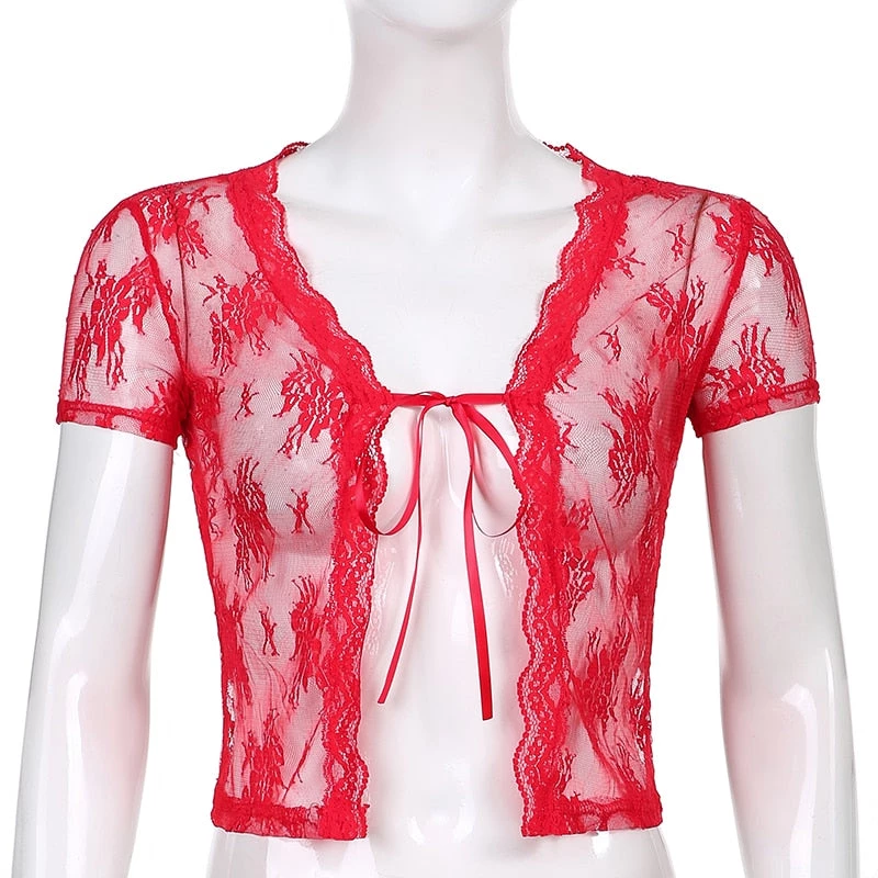 Red mesh see through lace open front crop top.