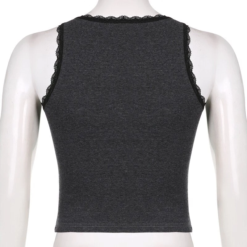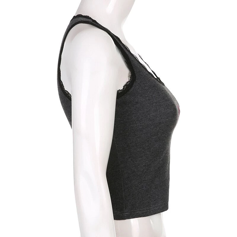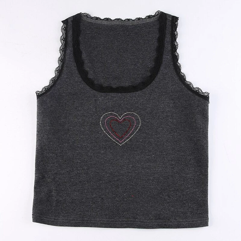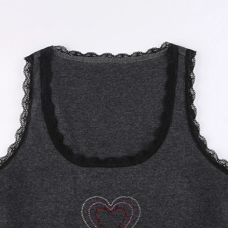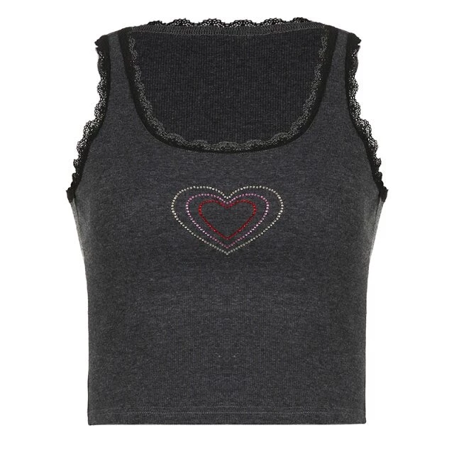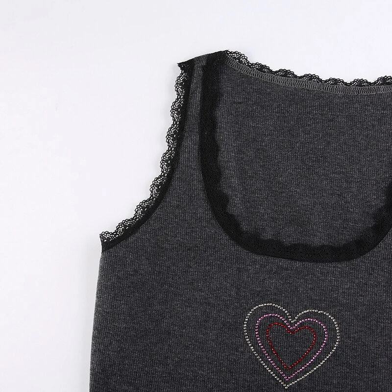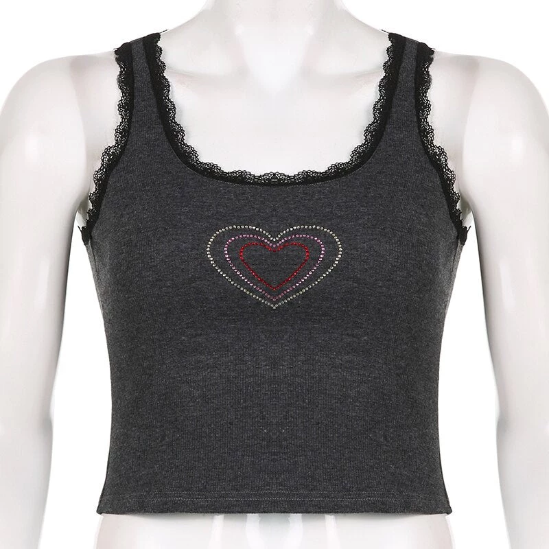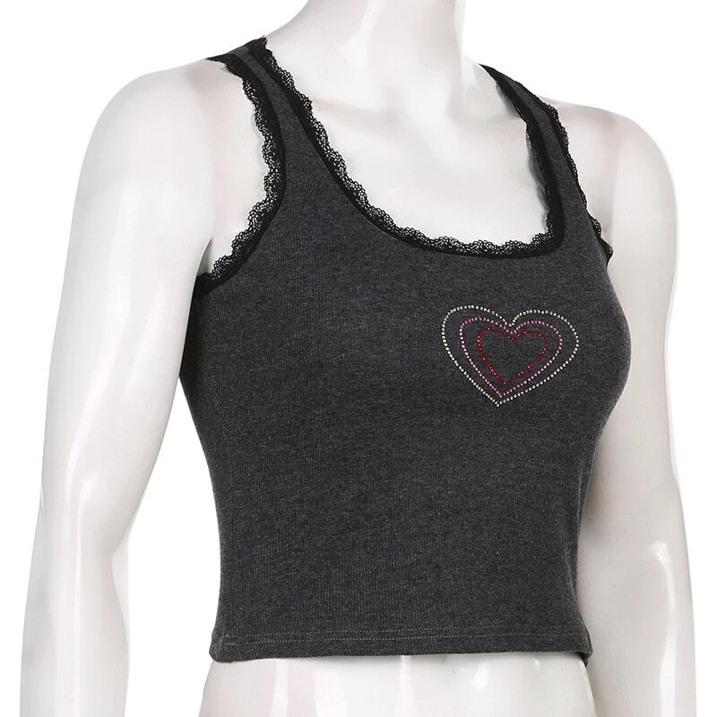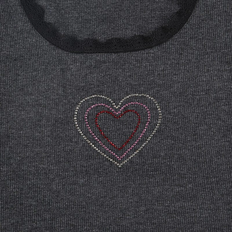 Grey vest crop top with a drilled hemline and rhinestone heart design.