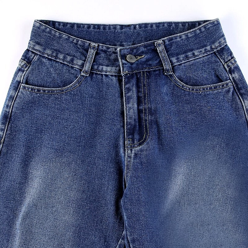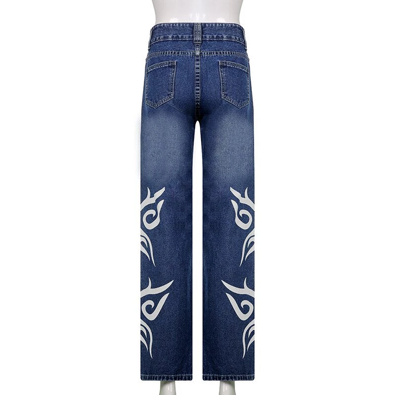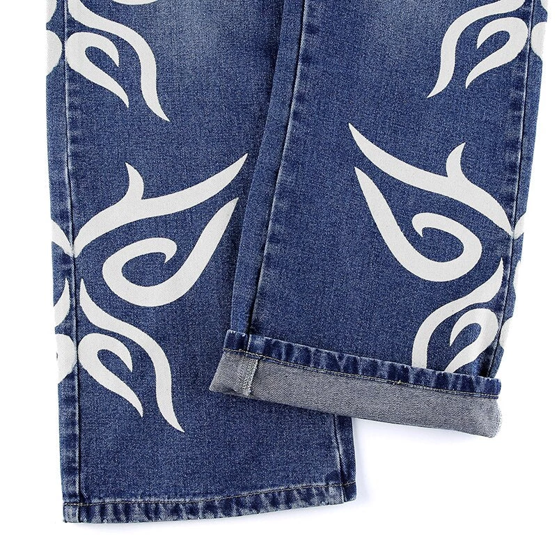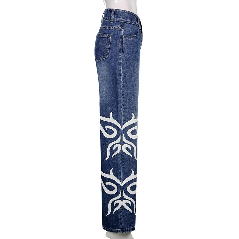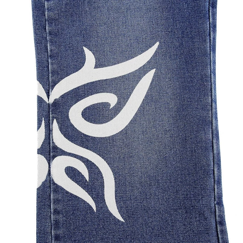 Mid-dark blue wash denim jeans with a white butterfly tattoo-style leg print.