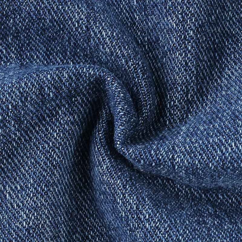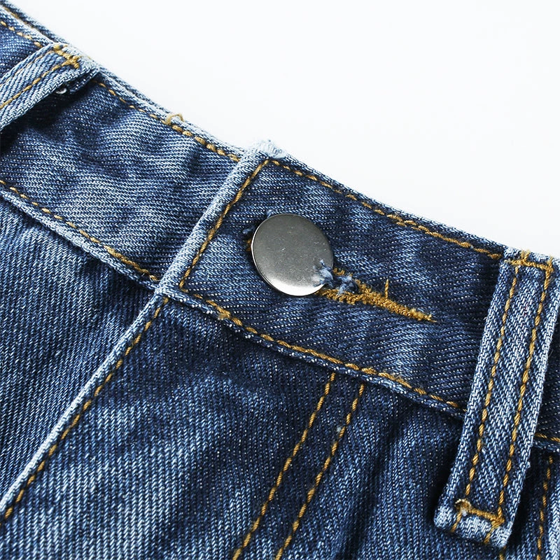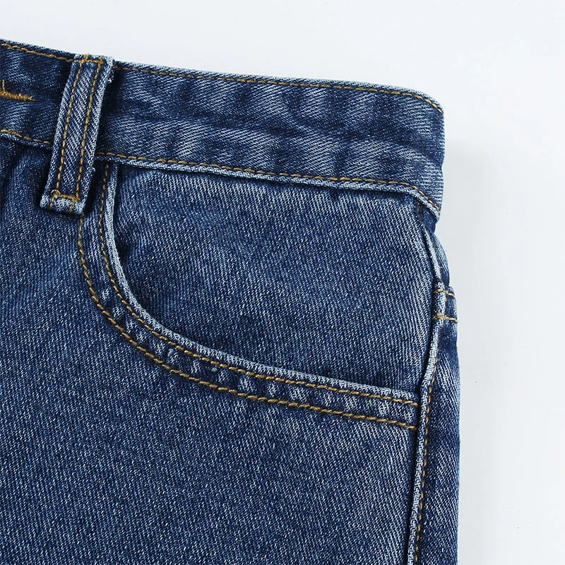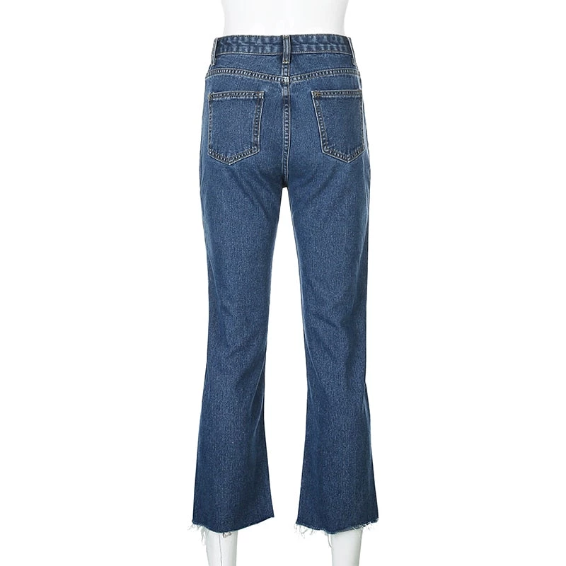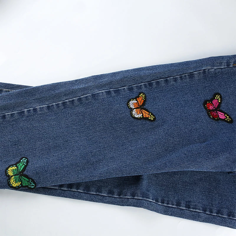 Blue denim jeans with a raw hem and colourful embroidered butterflies.