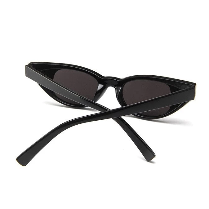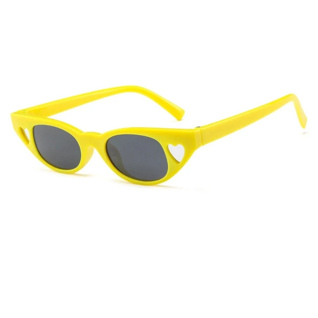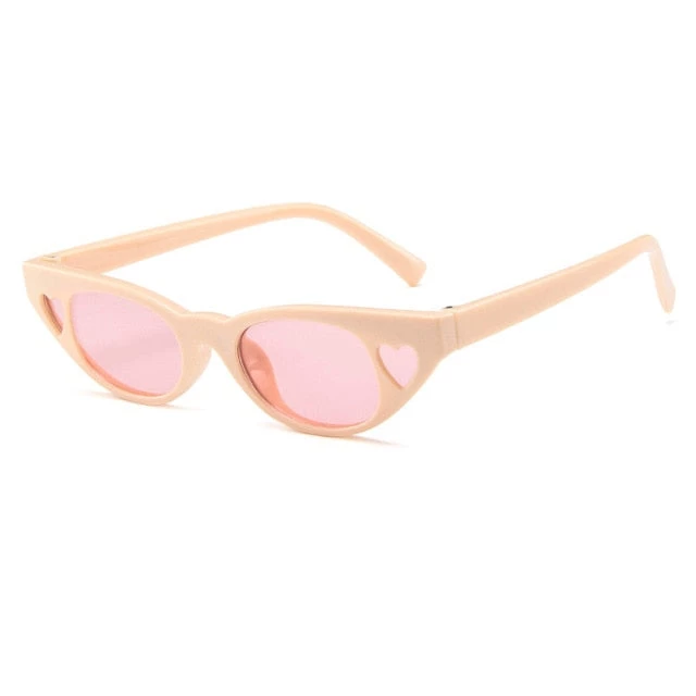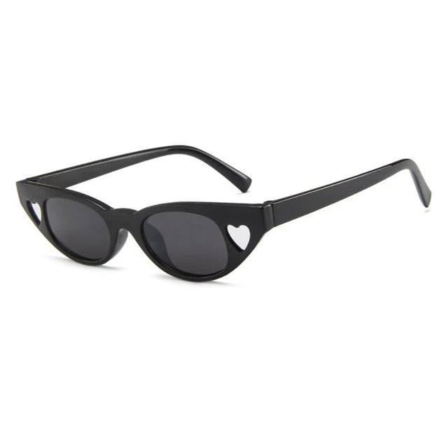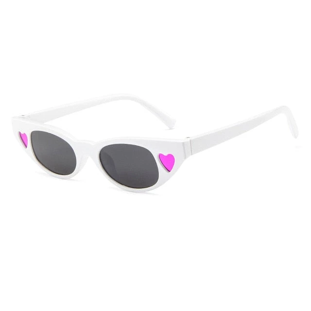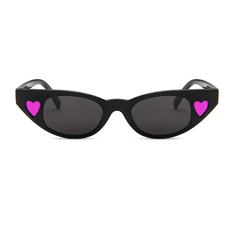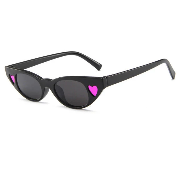 Plastic slight cateye-shaped sunglasses with heart decorations at the side of each eye.