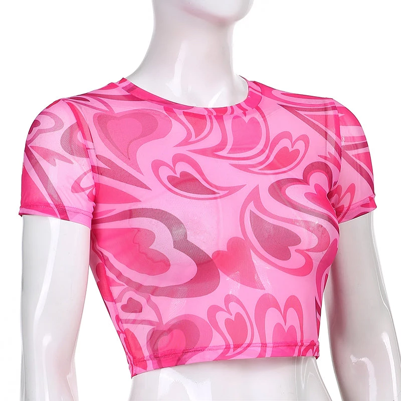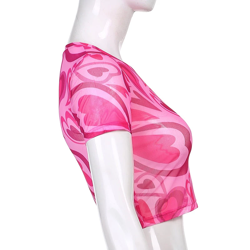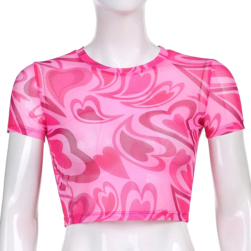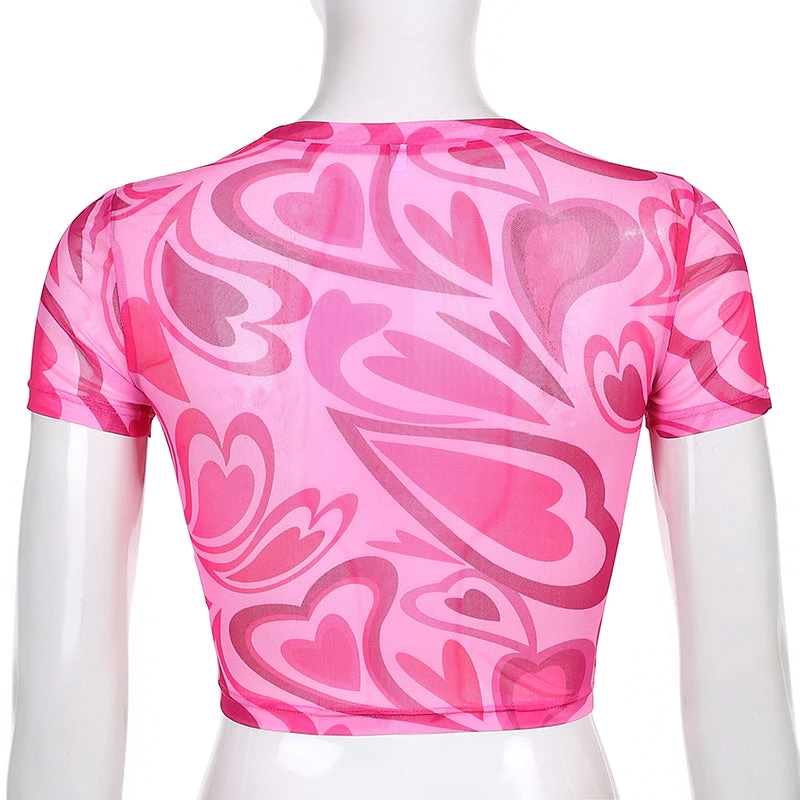 Pink semi sheer mesh crop top with a swirl heart print. Small fit.