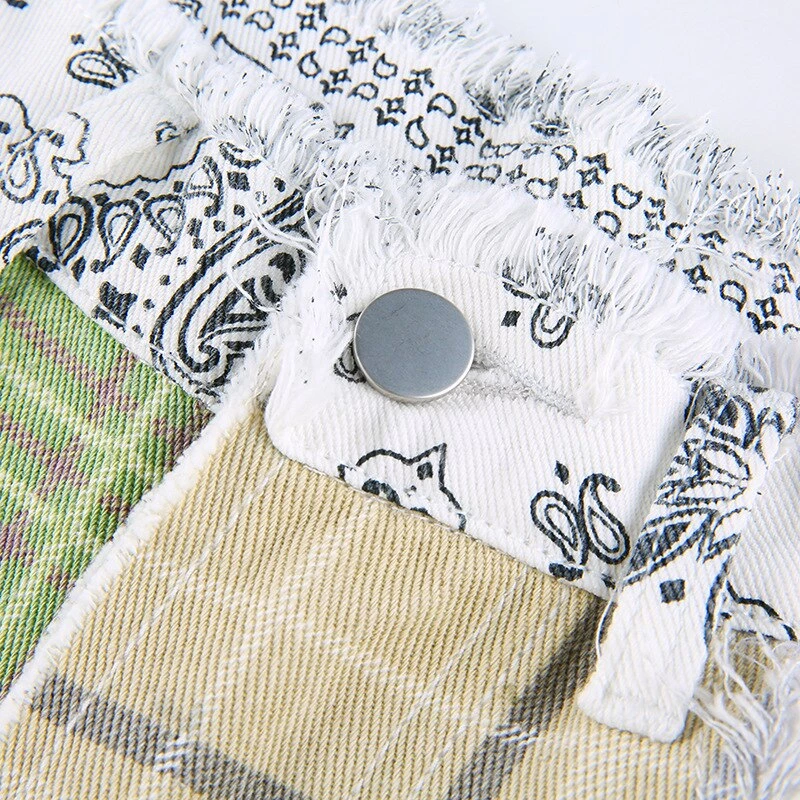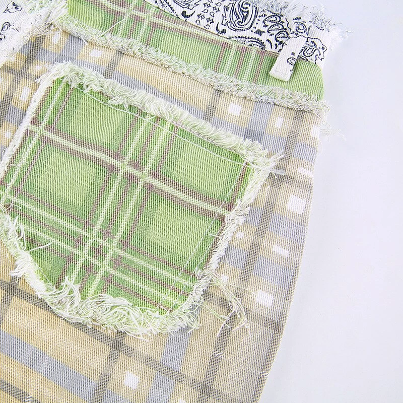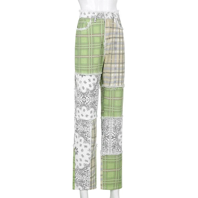 Green and yellow plaid and paisley print patchwork pants.