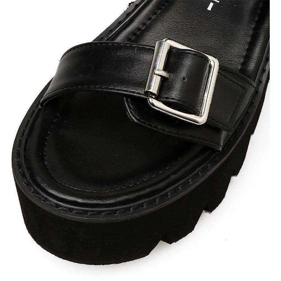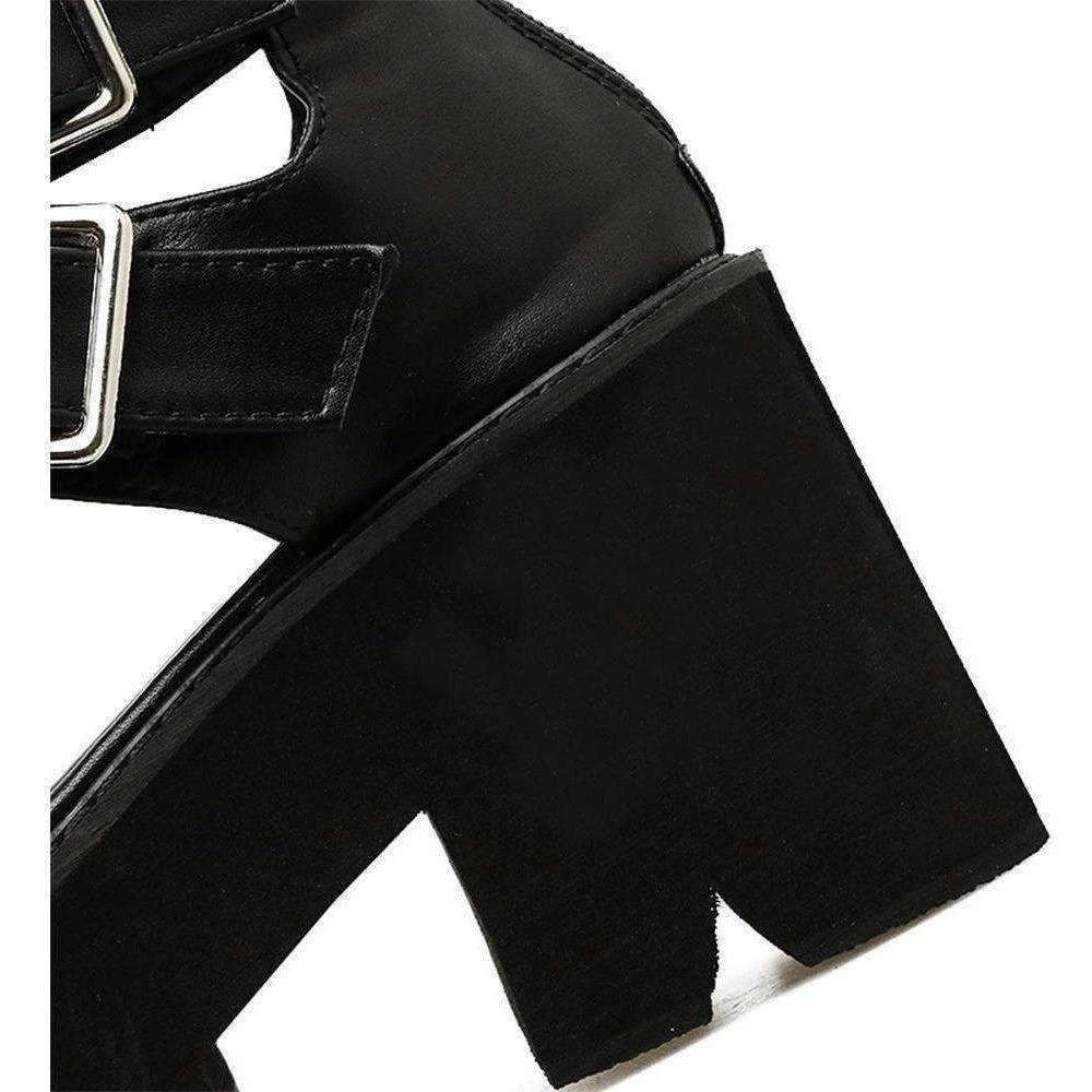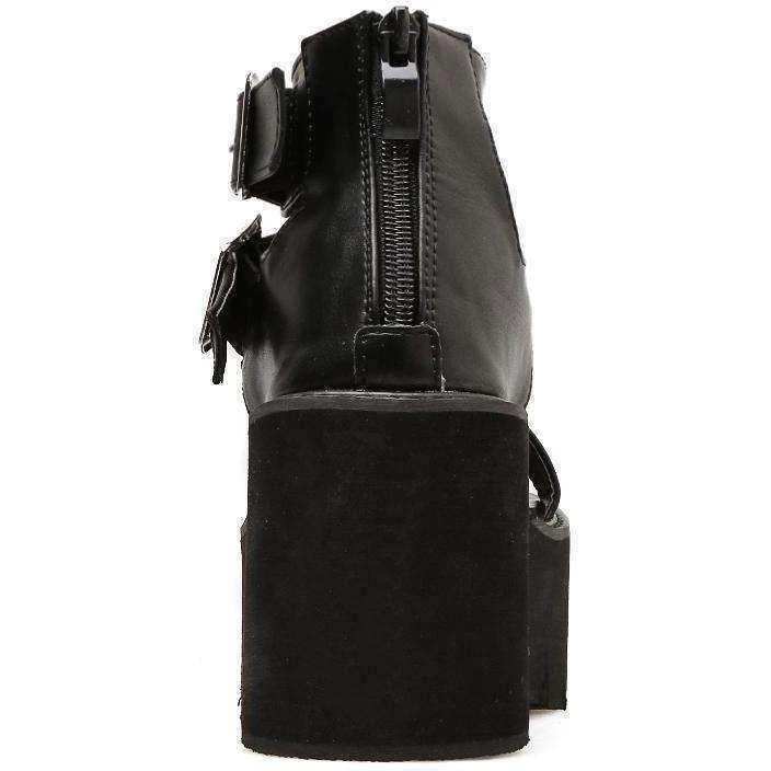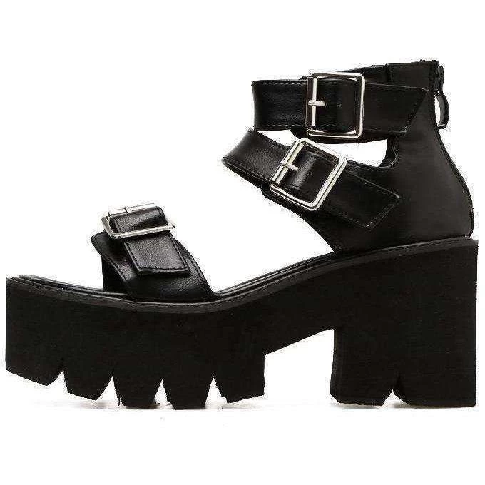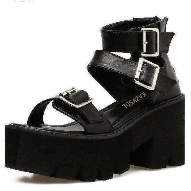 Black open toe gladiator-style platform sandals.