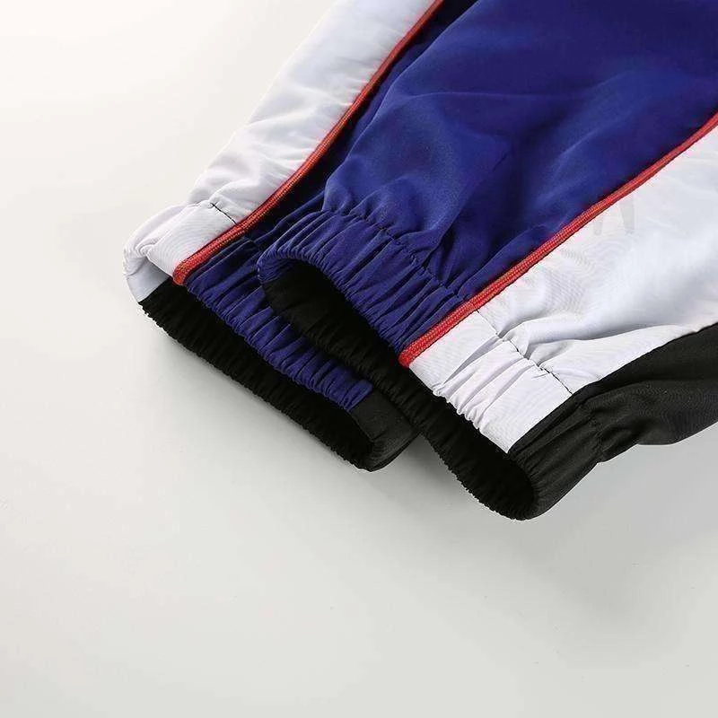 Black, yellow, white and blue block colour strip pants with a red lining.