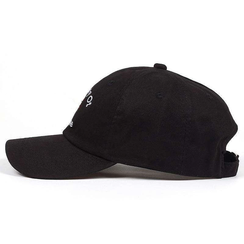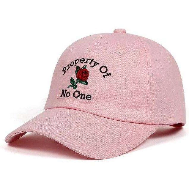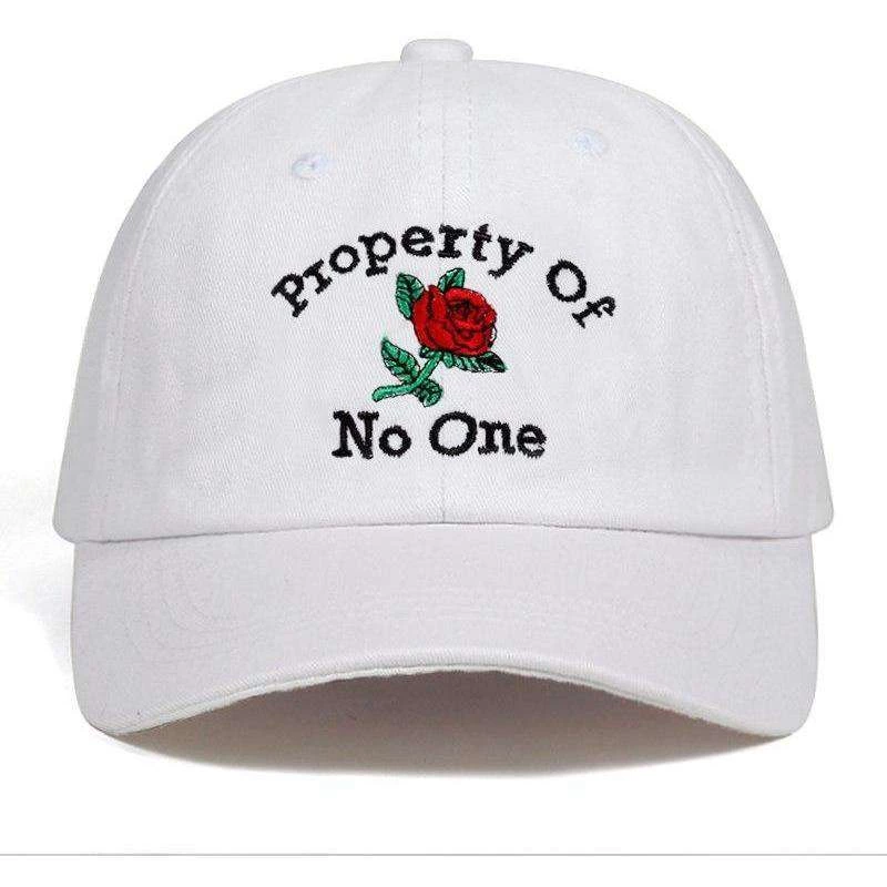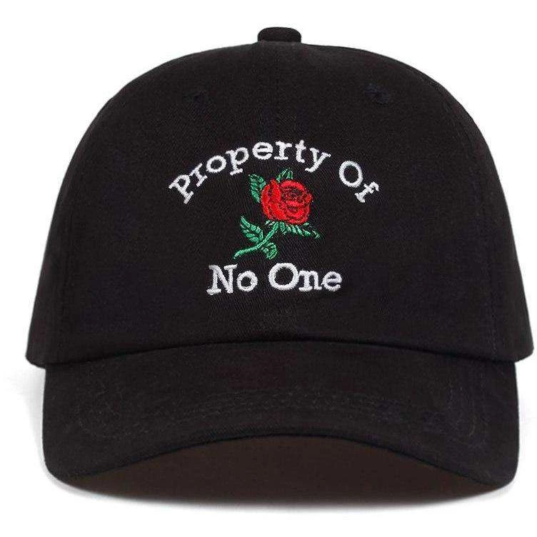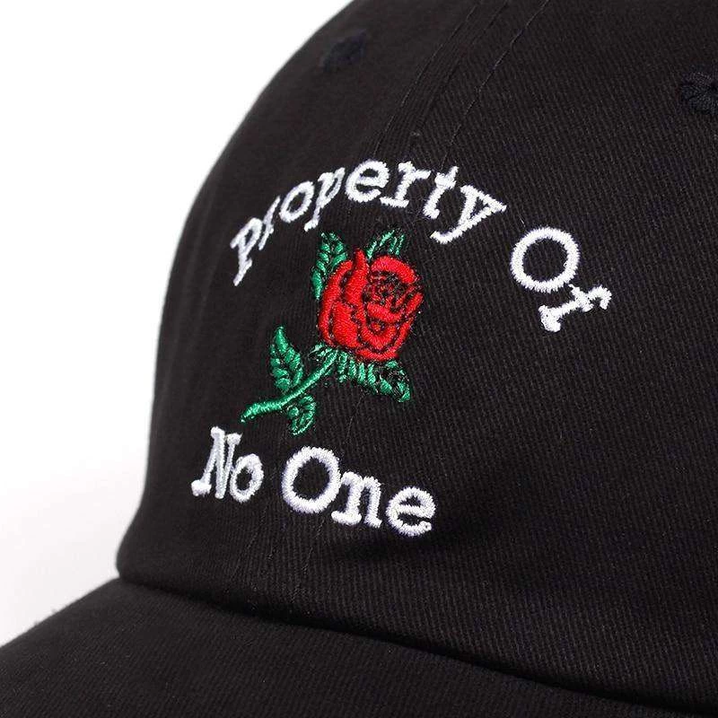 ‘PROPERTY OF NO ONE’ slogan and rose embroidered dad hat.