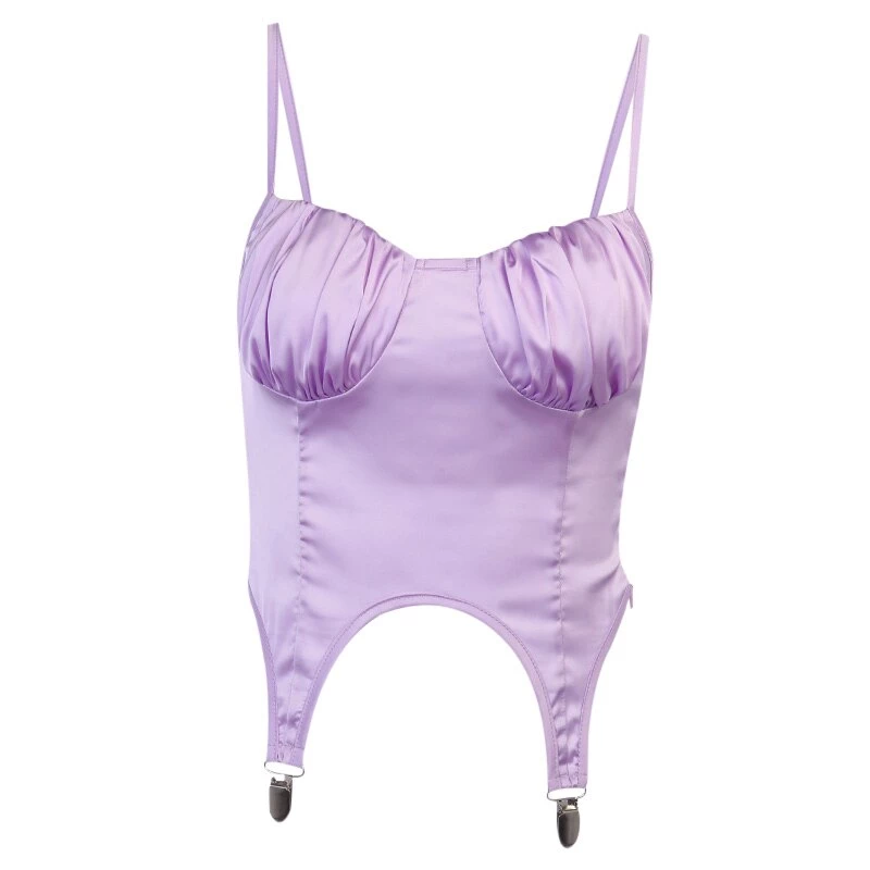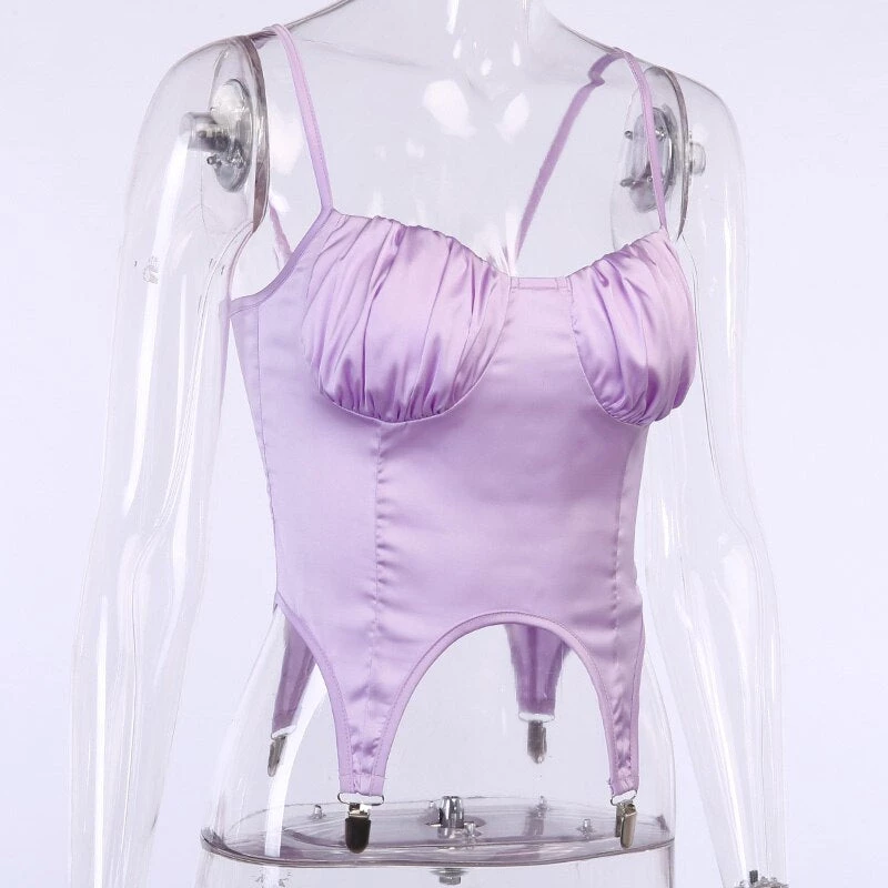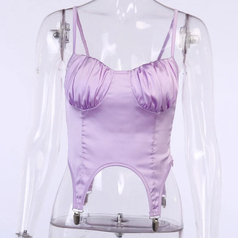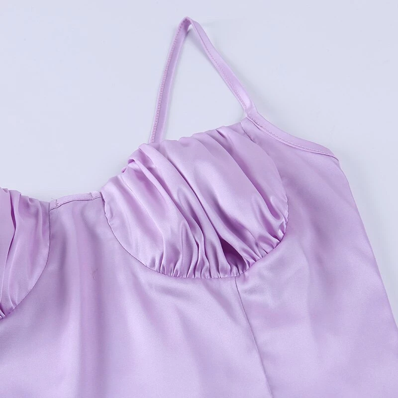 Purple ruched bust suspender-style top with spaghetti straps.