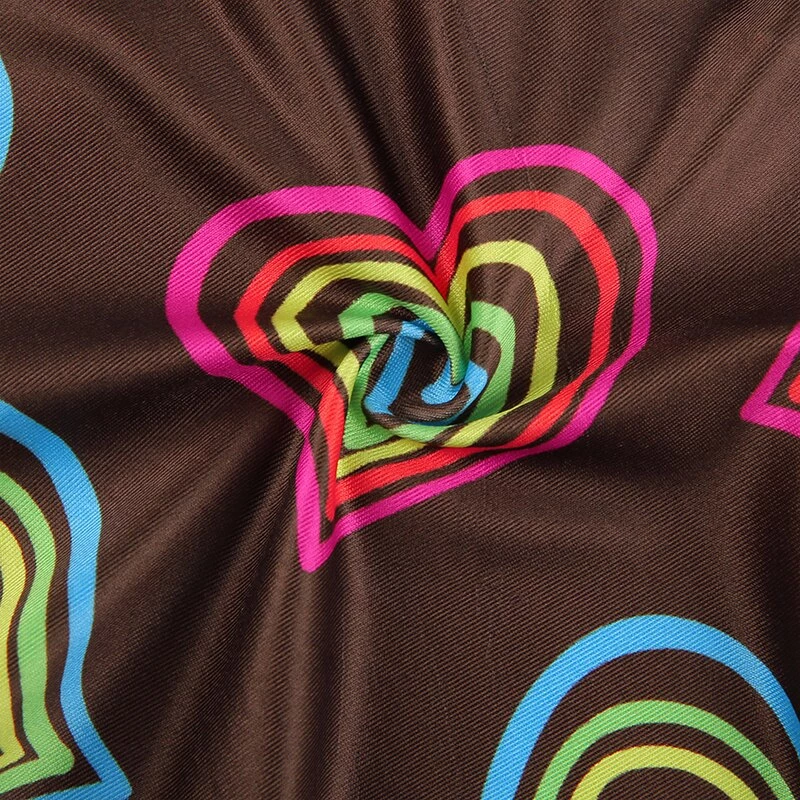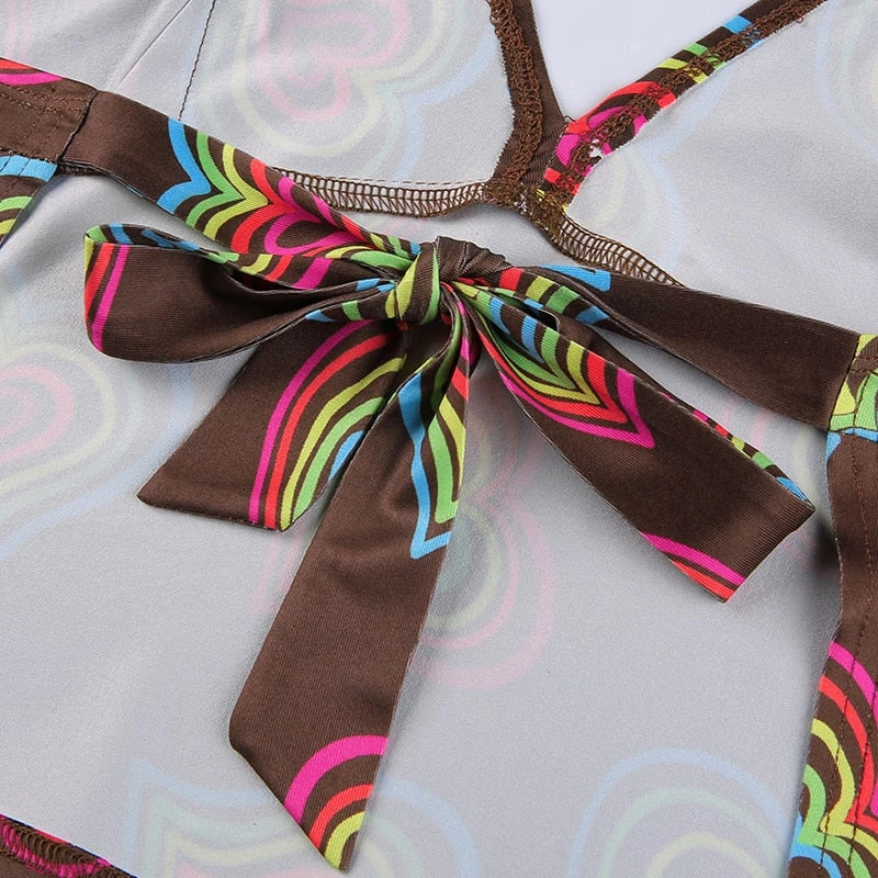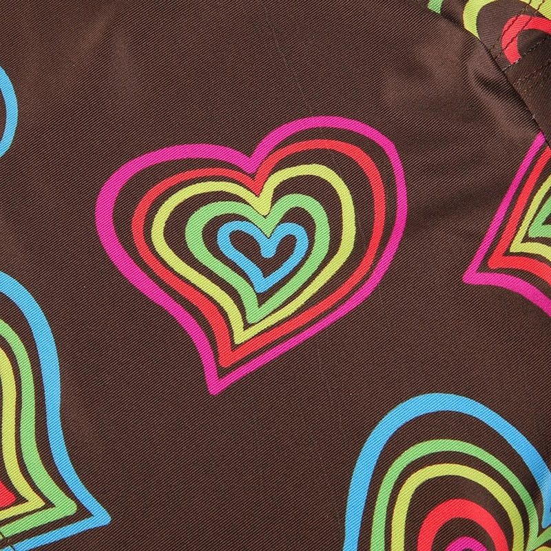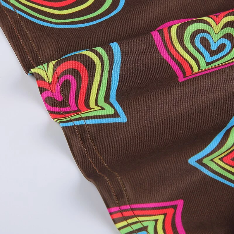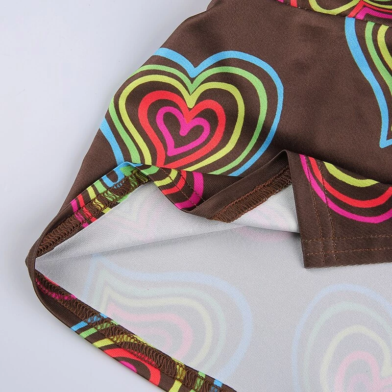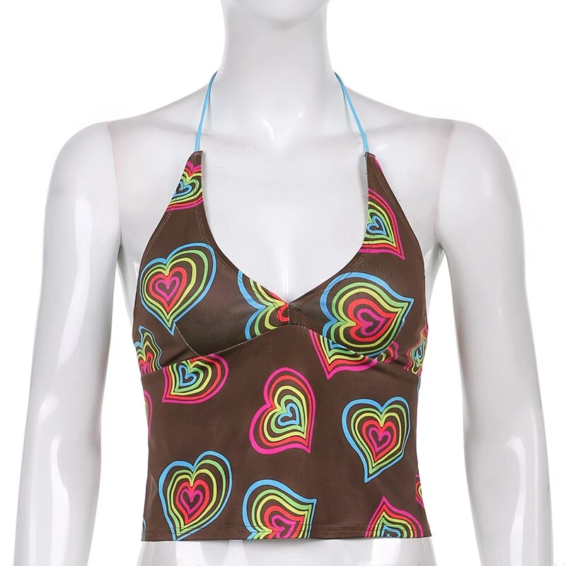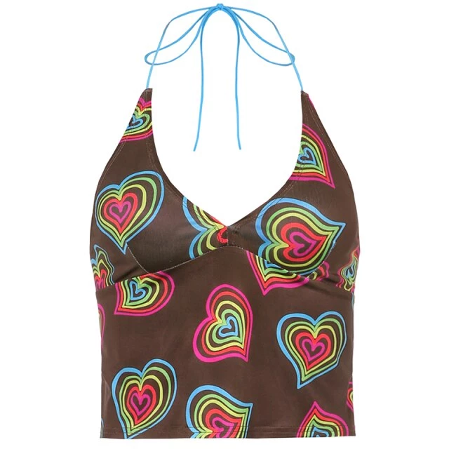Brown halter crop top with a vibrant multicoloured heart design.