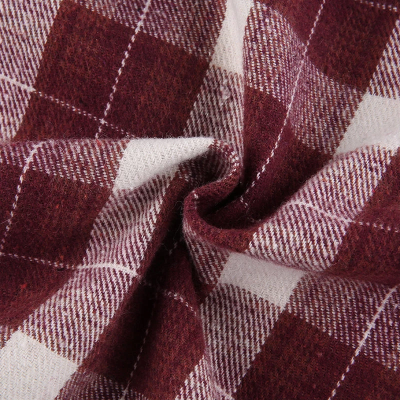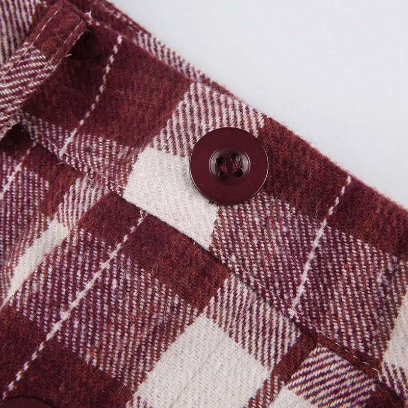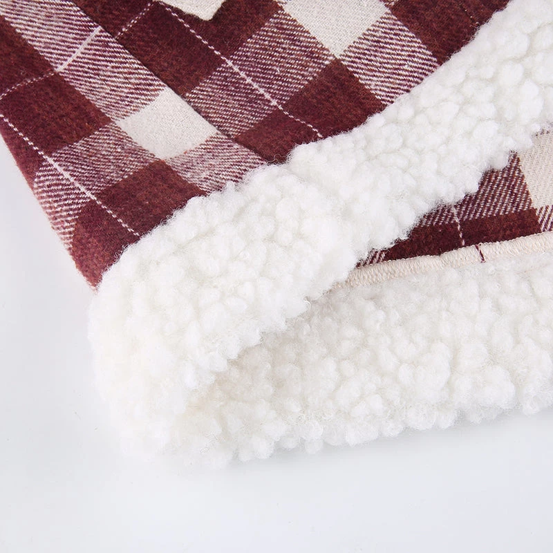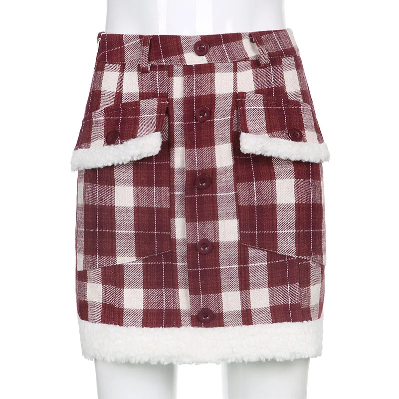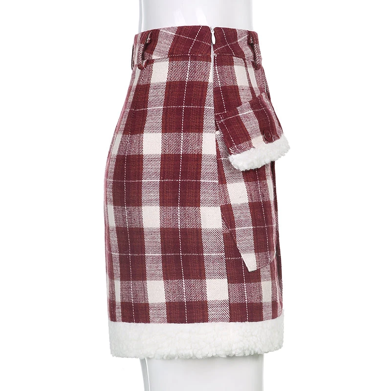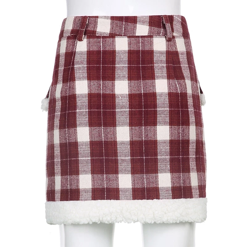 Red plaid mini skirt with a white faux fur trim.