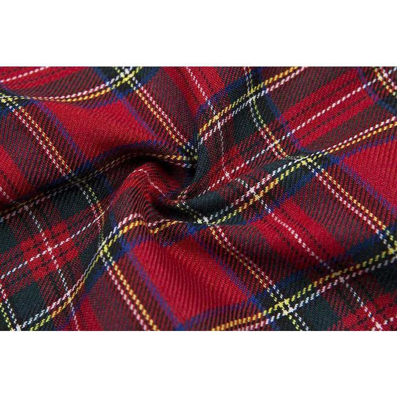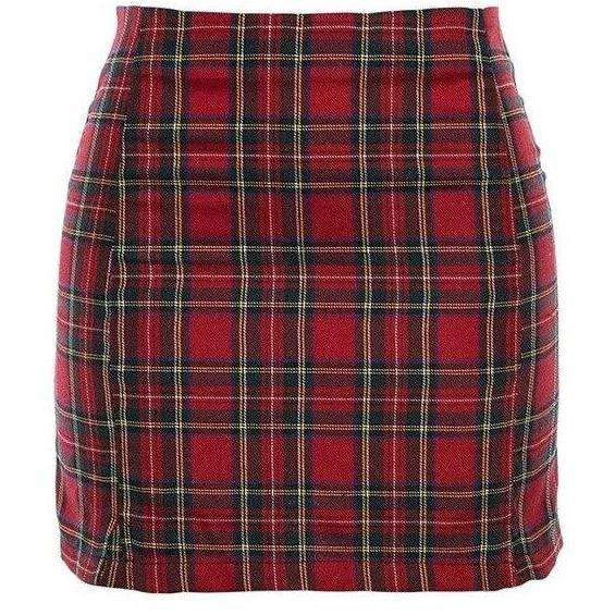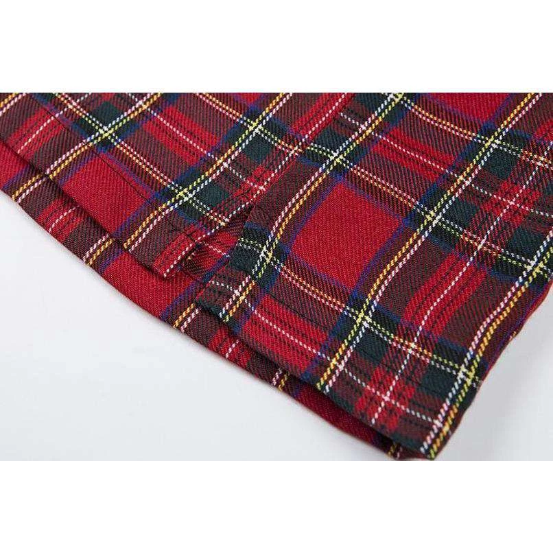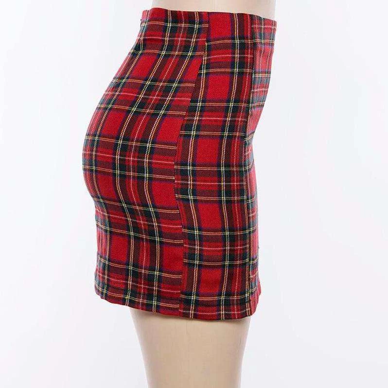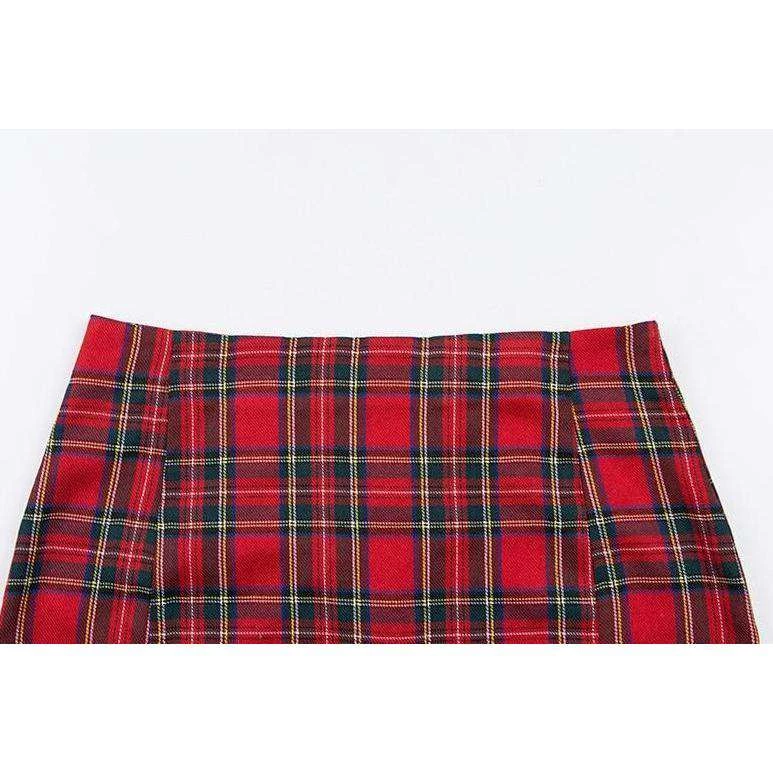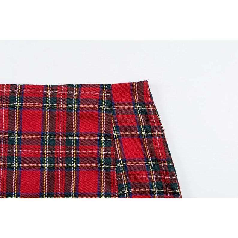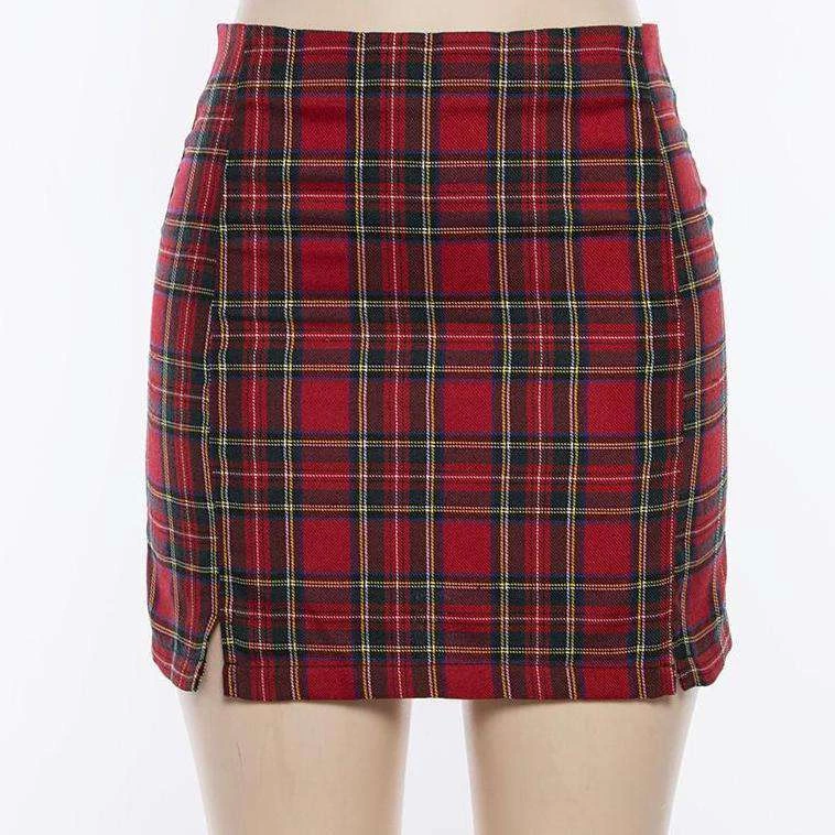 Red tartan plaid mini skirt with small side splits.