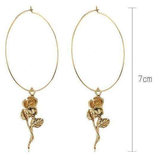 Gold coloured large hoop earrings with a drop rose design.