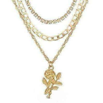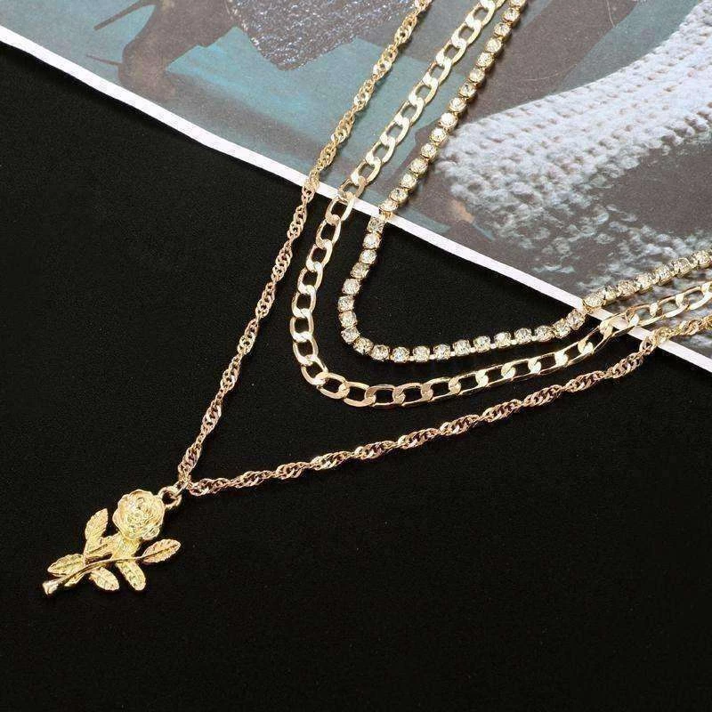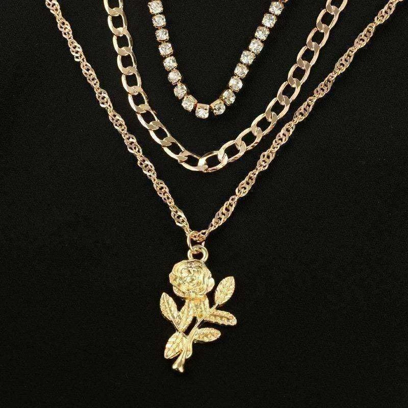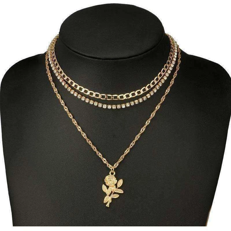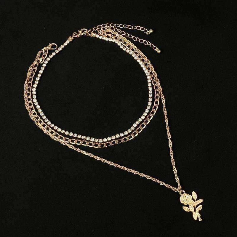 Three layered necklaces – chokers and pendants with rhinestone and rose details.