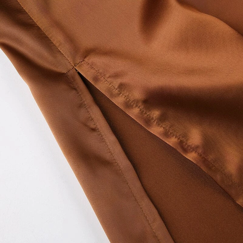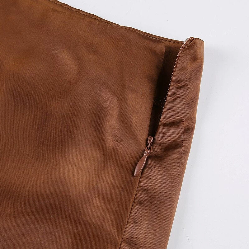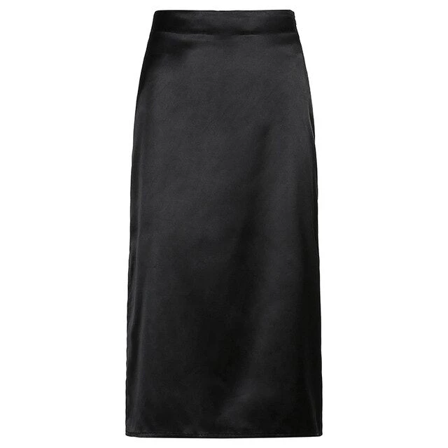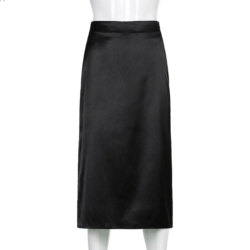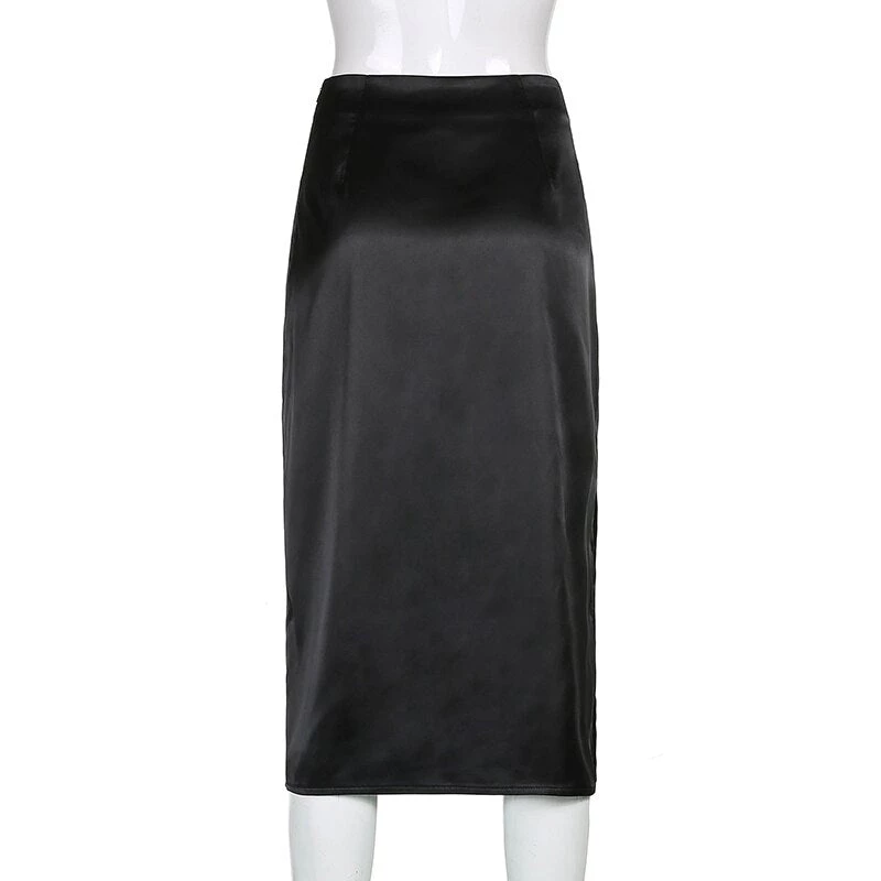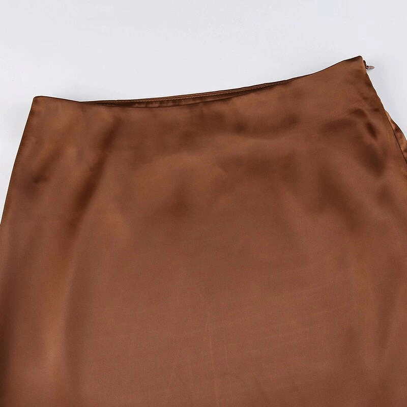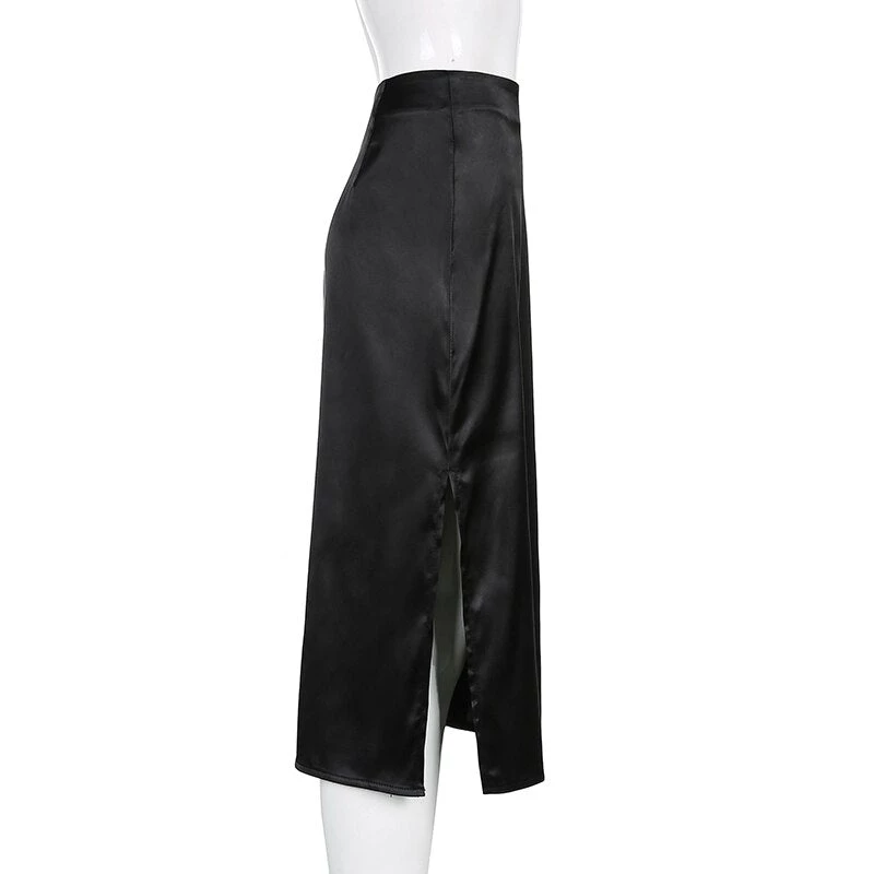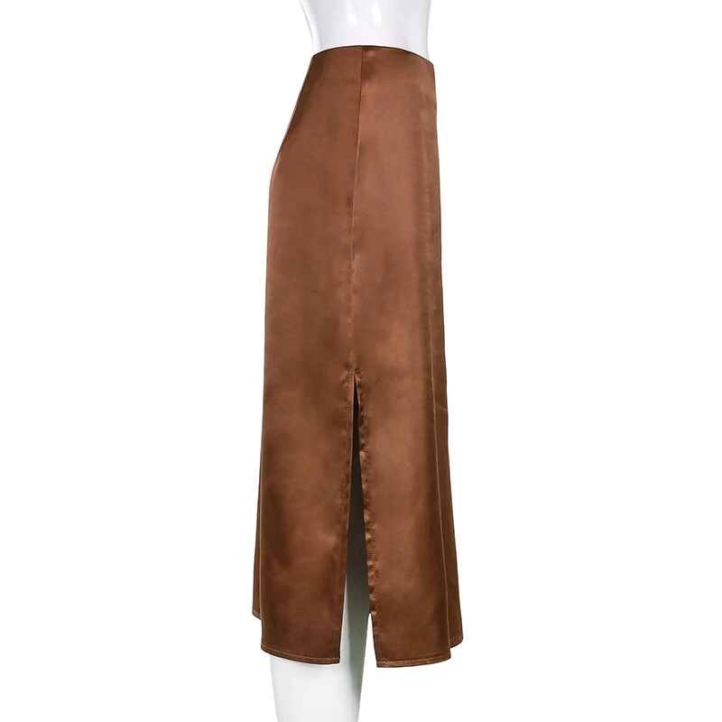 Black or brown midi satin skirt with a side split. Fastens with a side zip.
