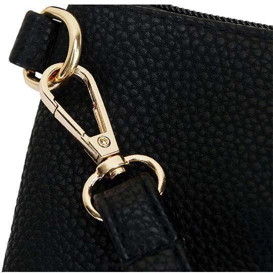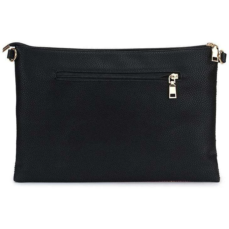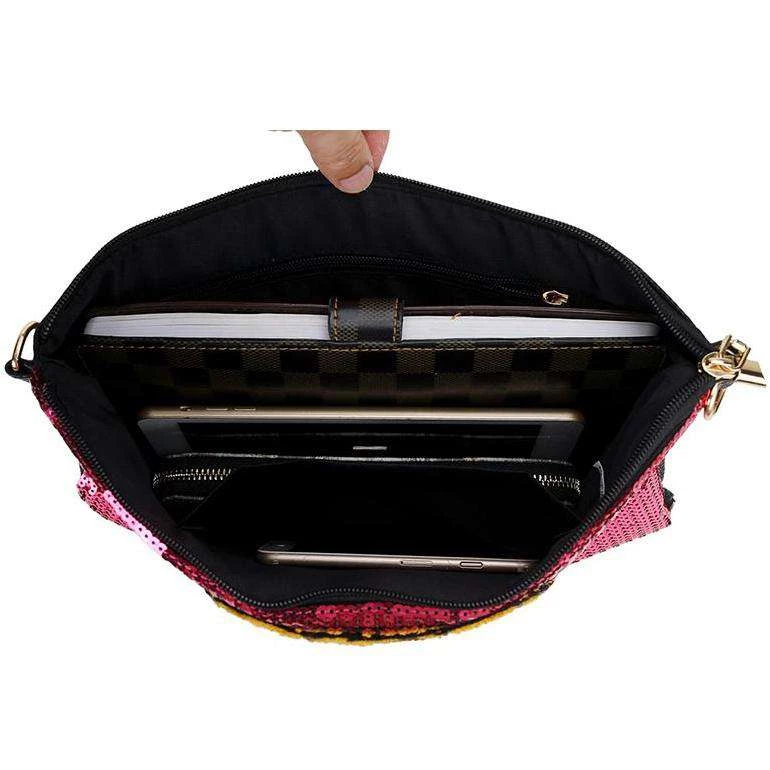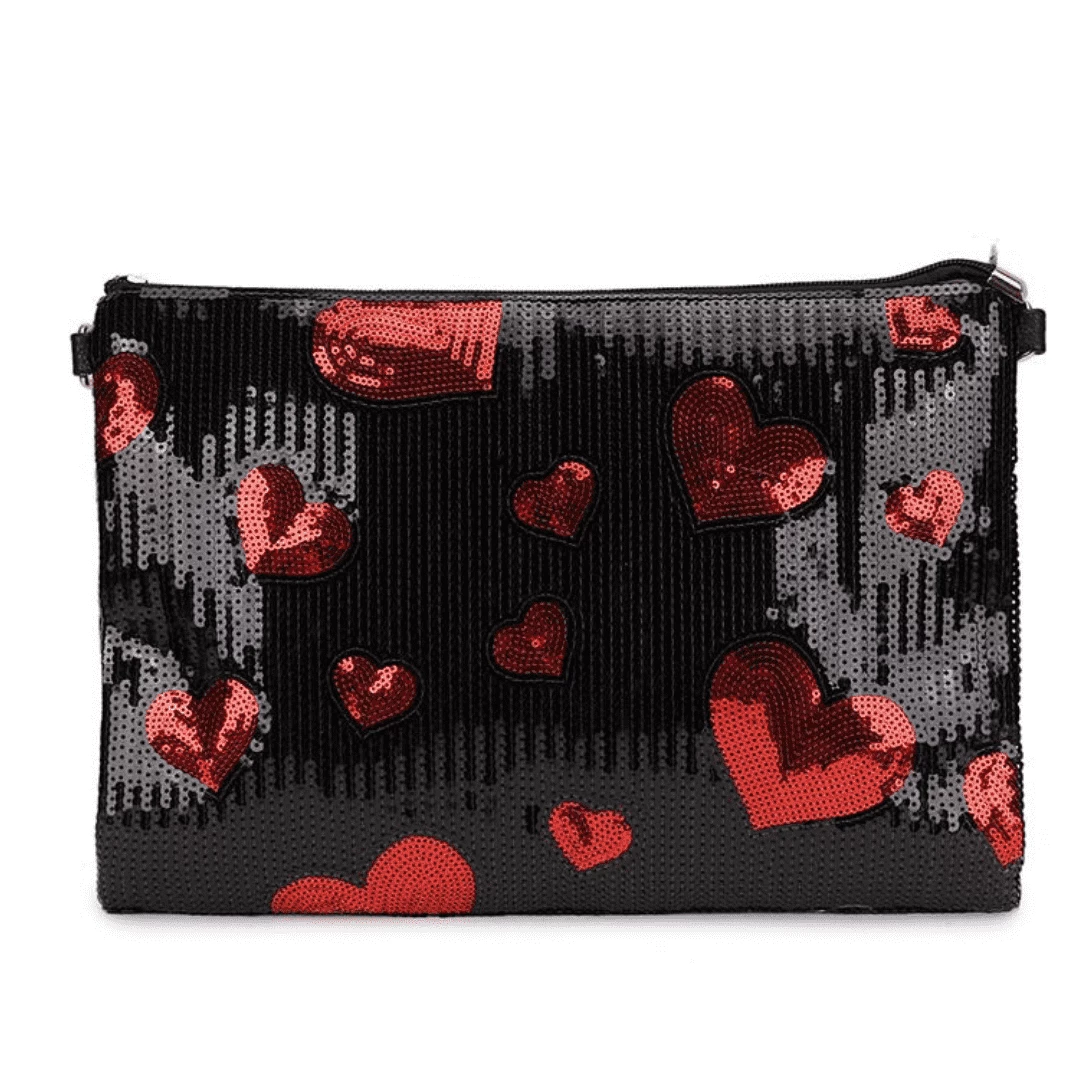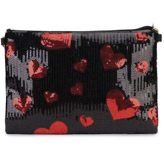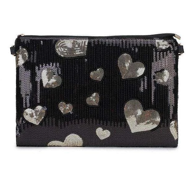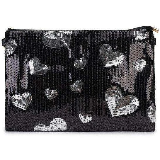 Black sequin clutch bag with a sequin heart design and single shoulder strap.