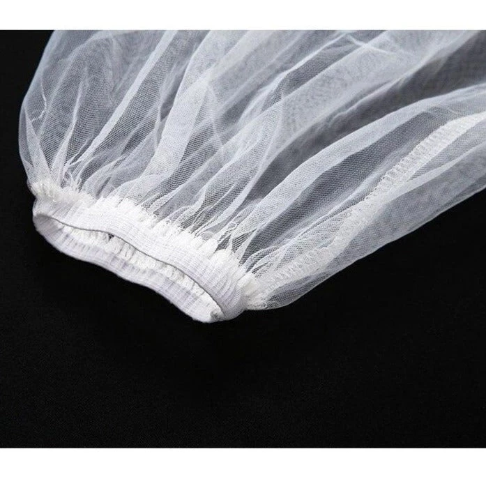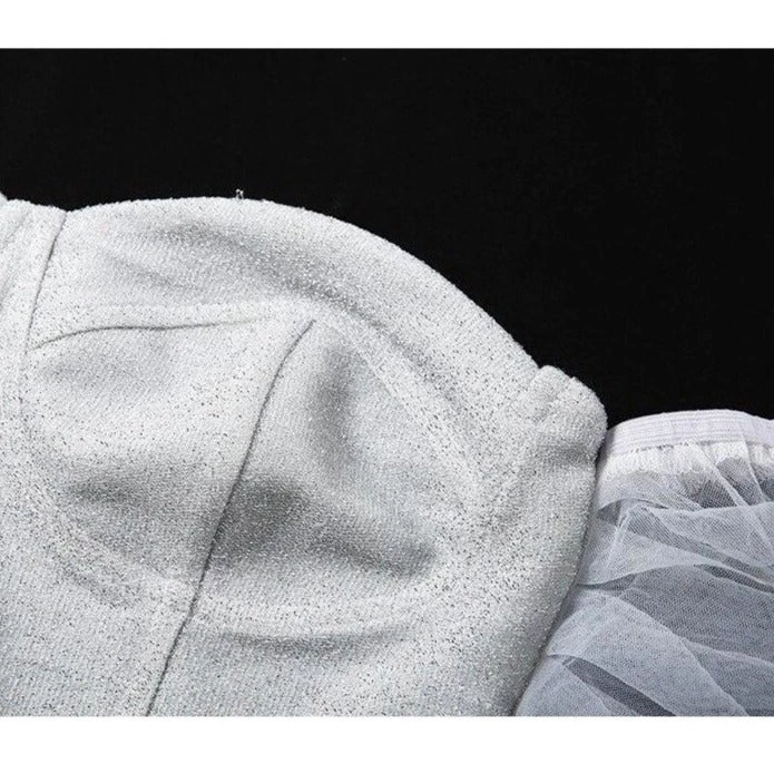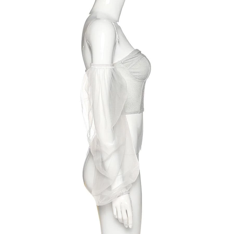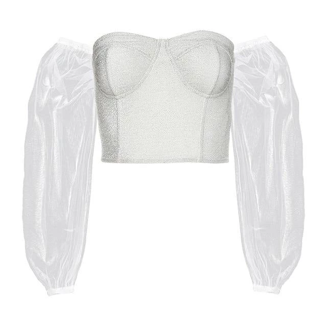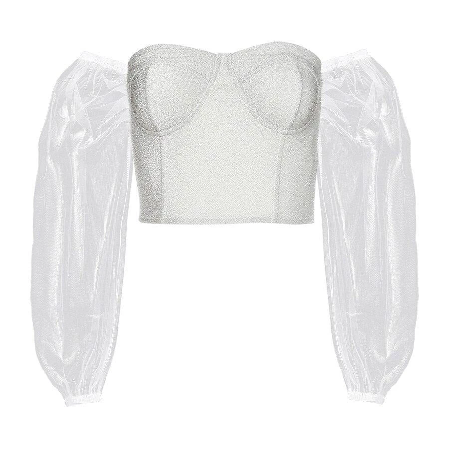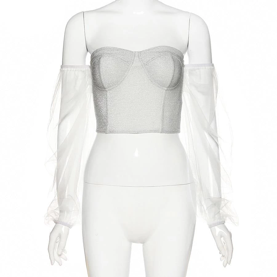 White shimmer corset bodied-top with off shoulder mesh sleeves.