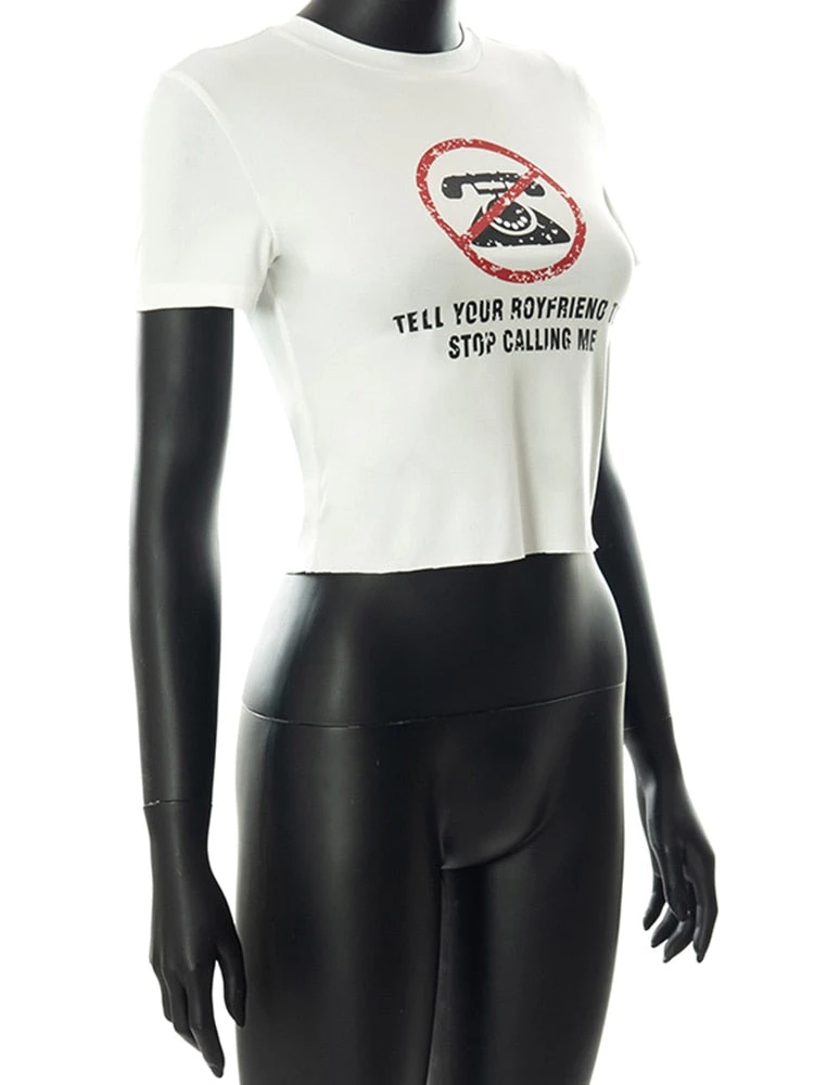 White’ TELL YOUR BOYFRIEND TO STOP CALLING ME’ slogan and graphic print t-shirt.