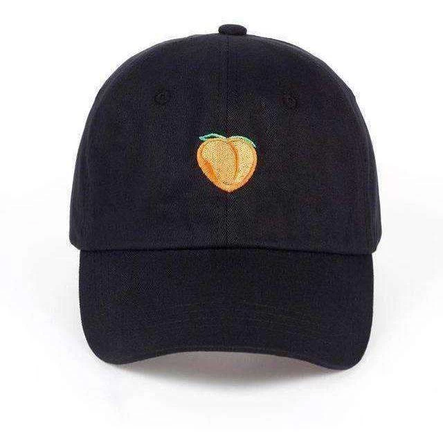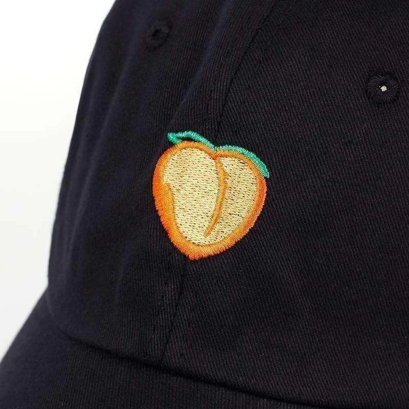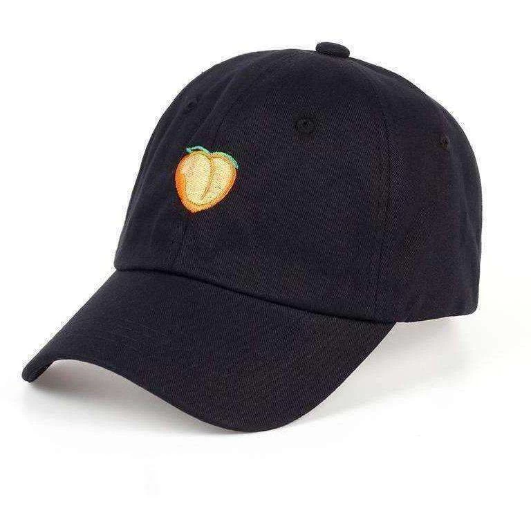 Black baseball cap/dad hat with a peach emonji embroidery.