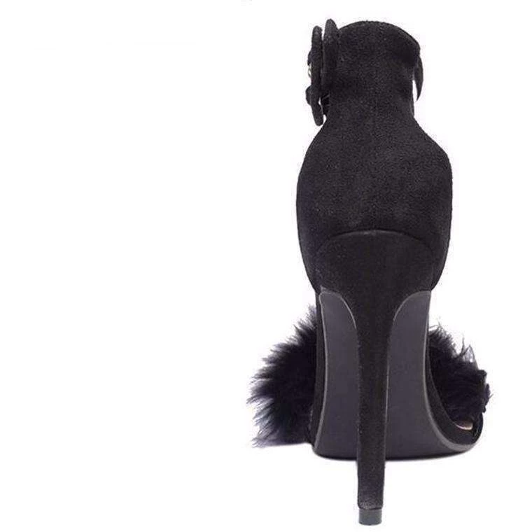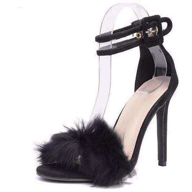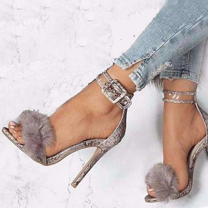 Simple heels with a furry foot strap and transparent ankle buckle strap.