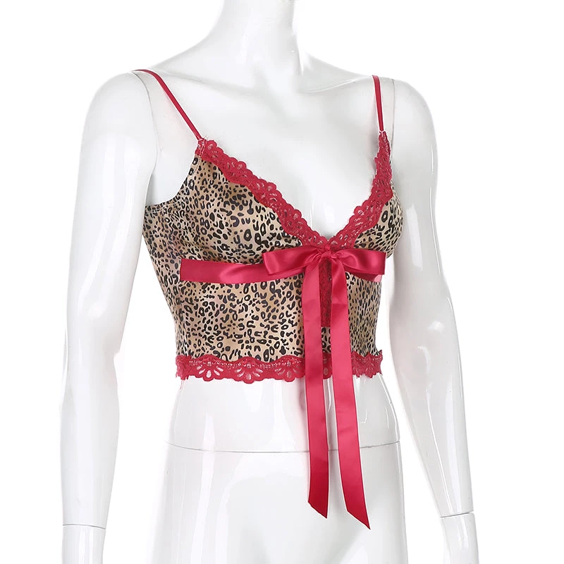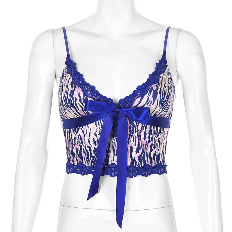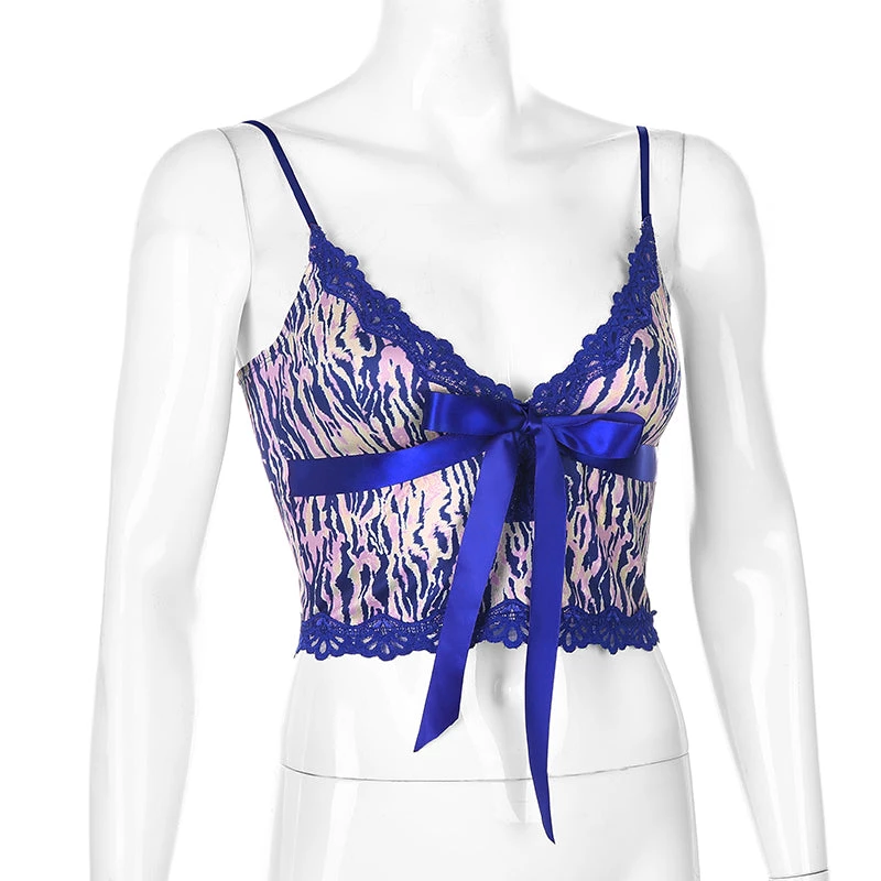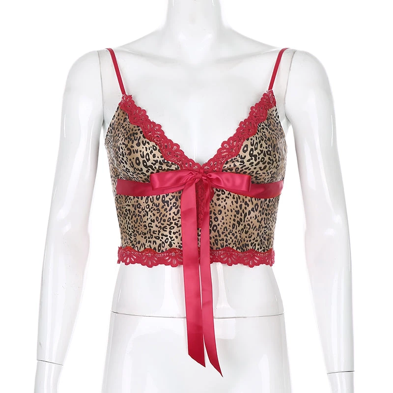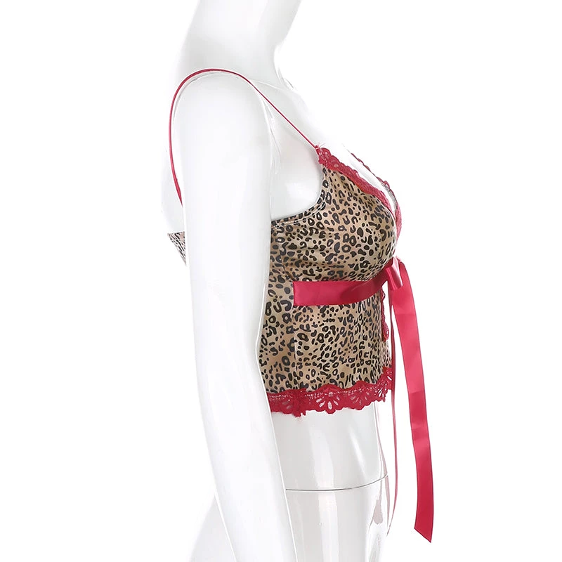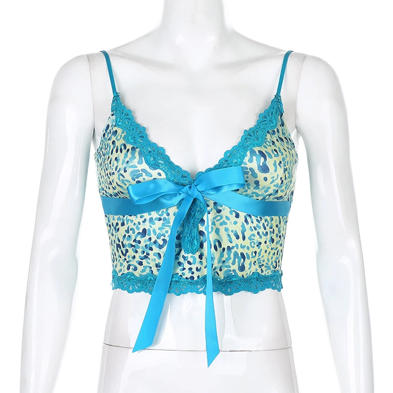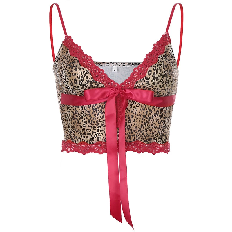 Animal print cami crop with a bow, lace trim and spaghetti straps.