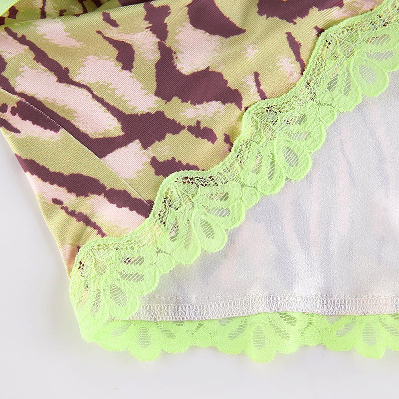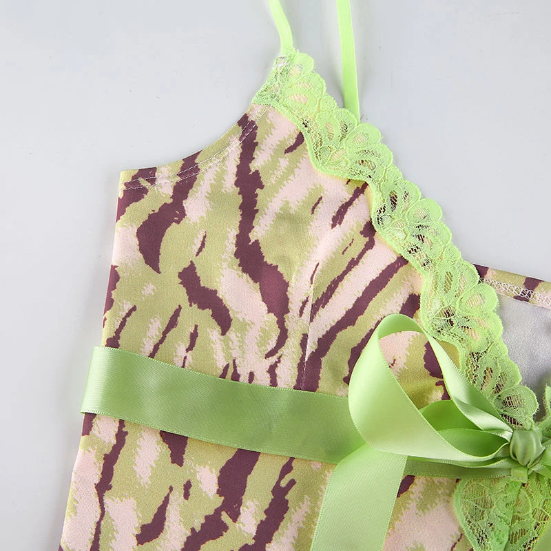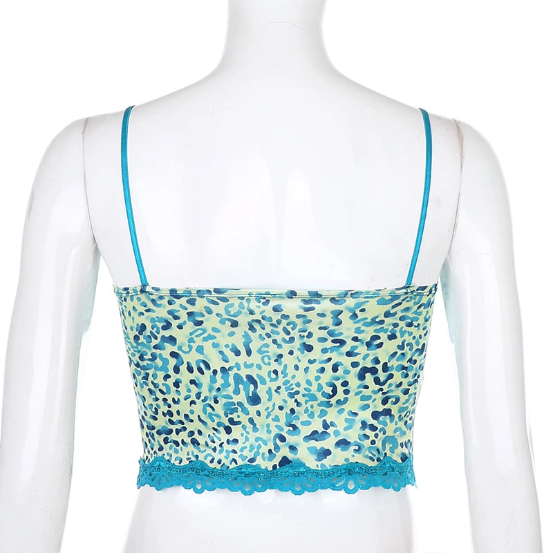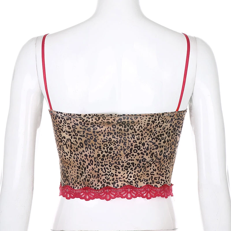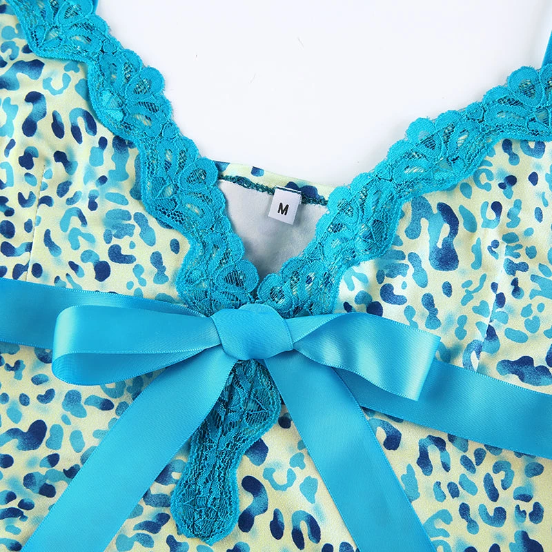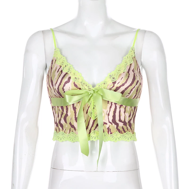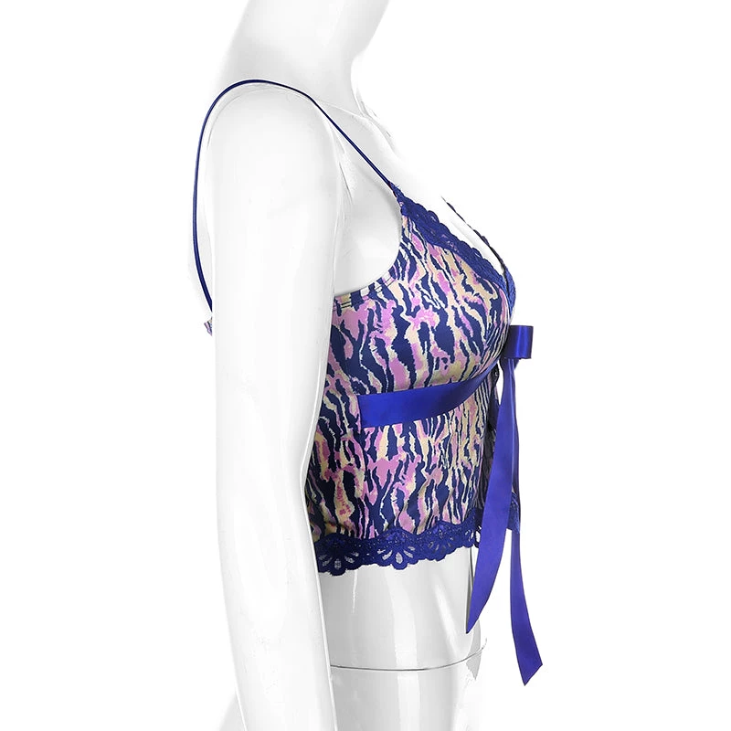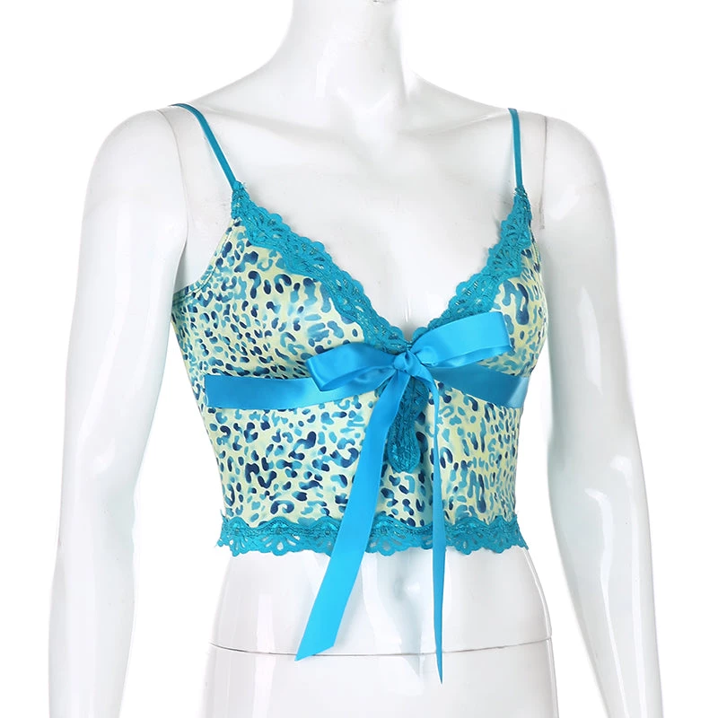 Animal print cami crop with a bow, lace trim and spaghetti straps.