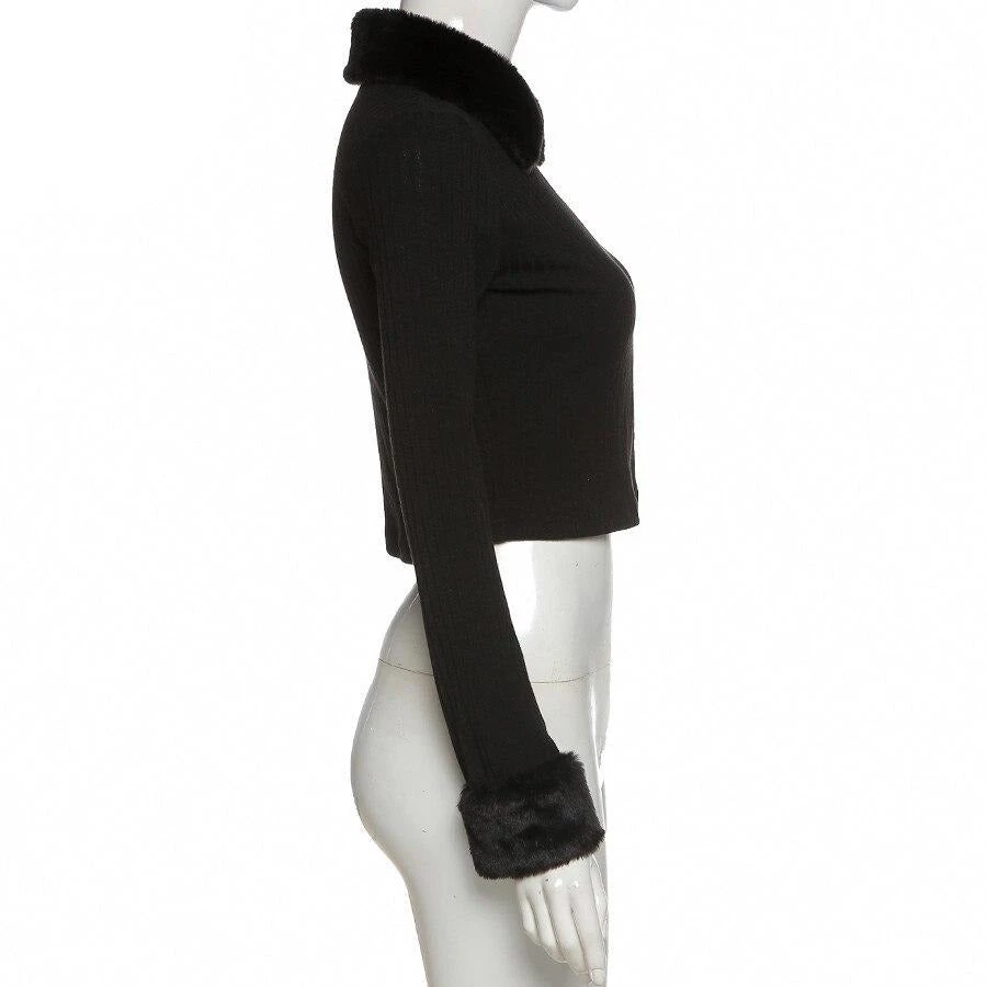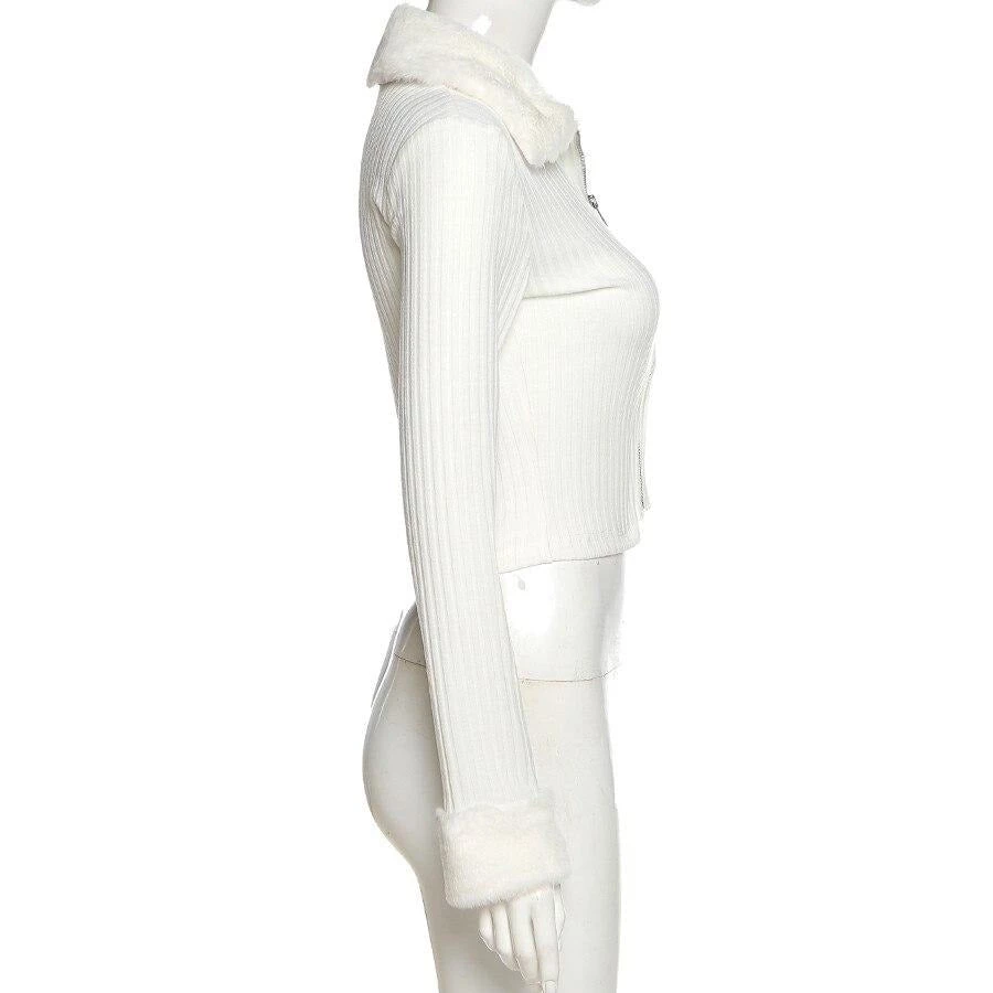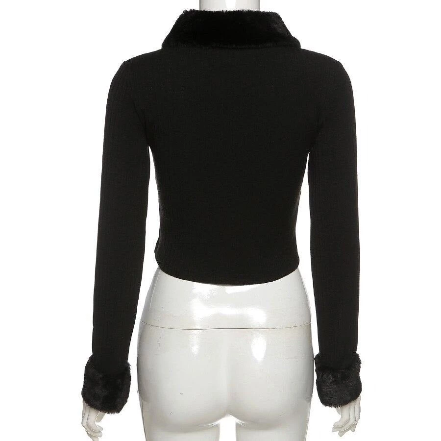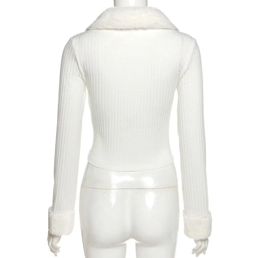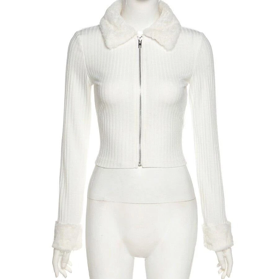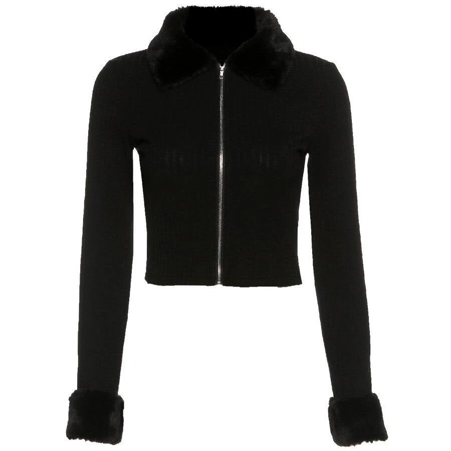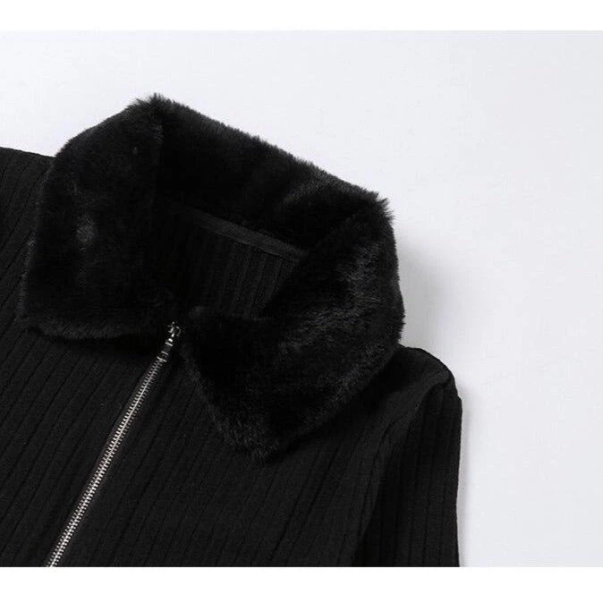 Black or white thin and fitted cardigan with a zip fastening and faux fur collar and cuffs.