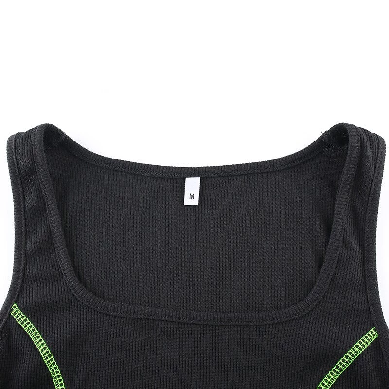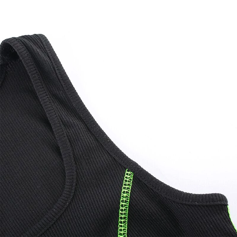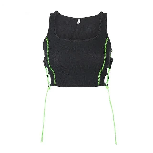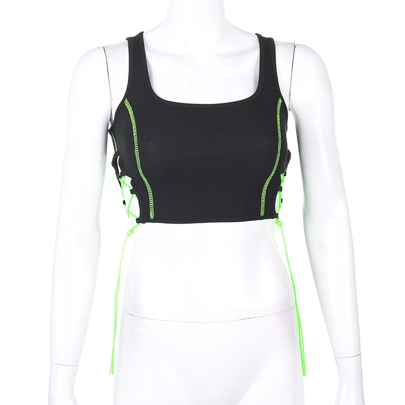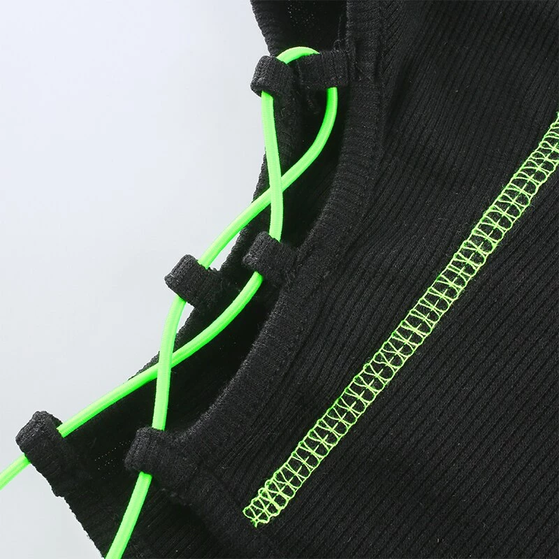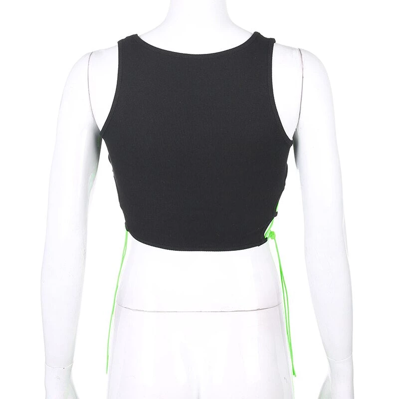 Black ribbed crop top with neon green contrast sticthing and side lacing.