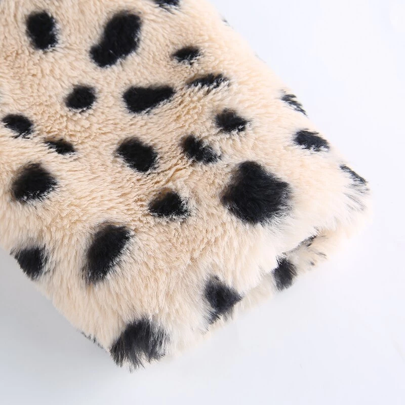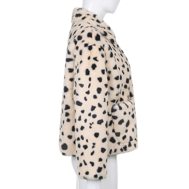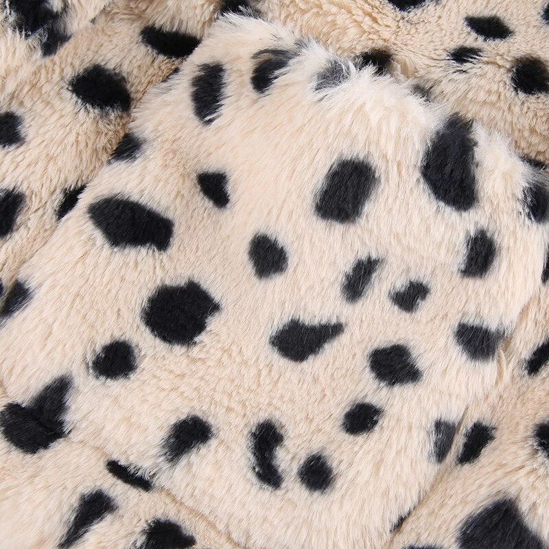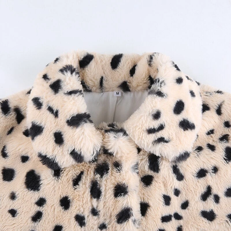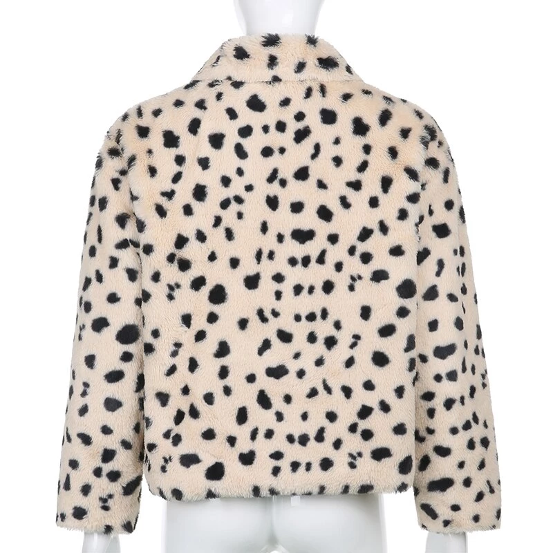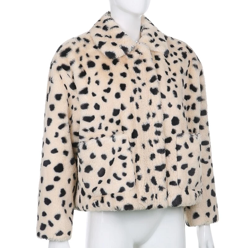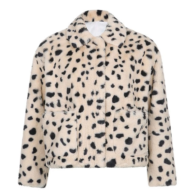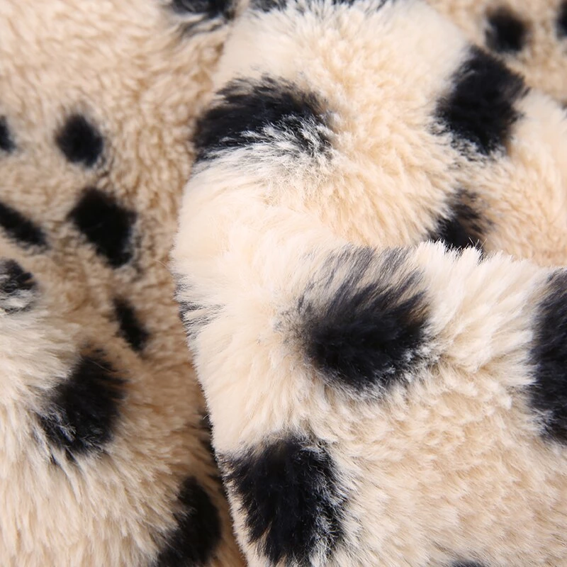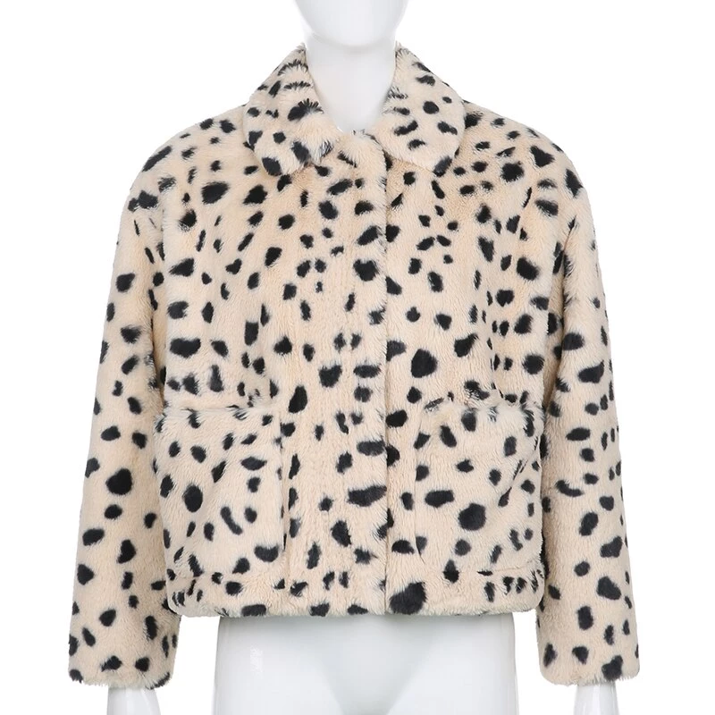 Khaki faux fur leopard print collared jacket with large front pockets.