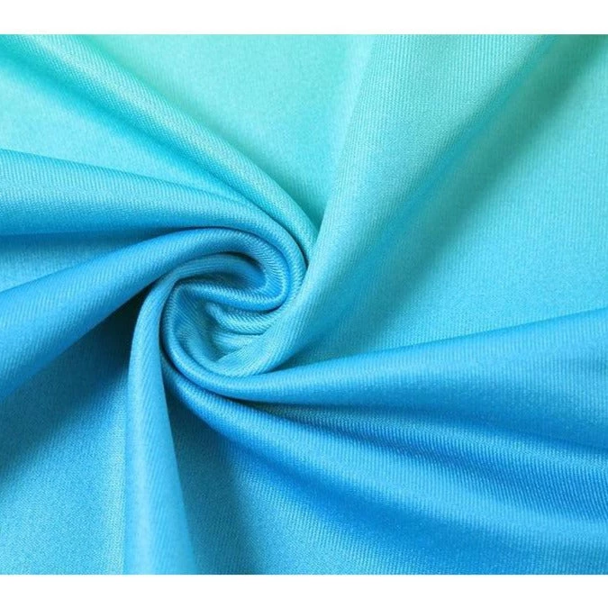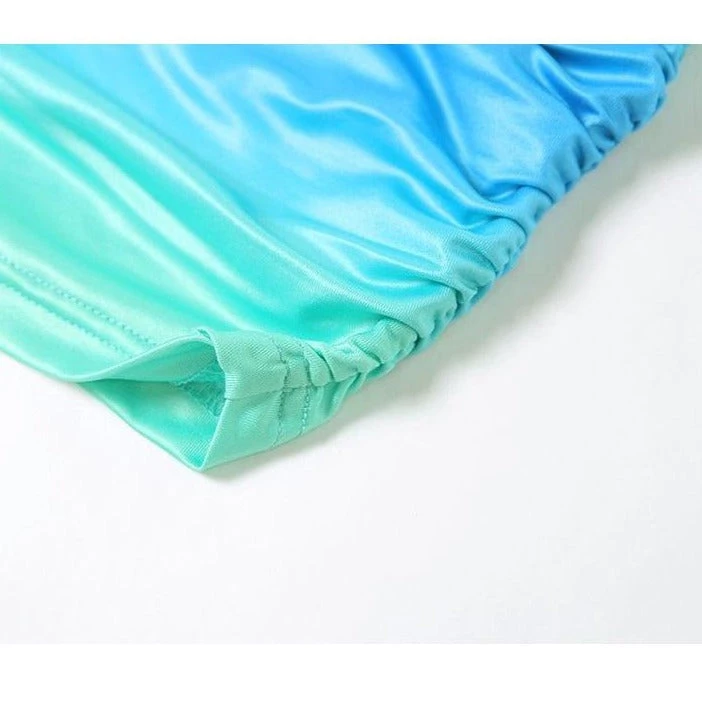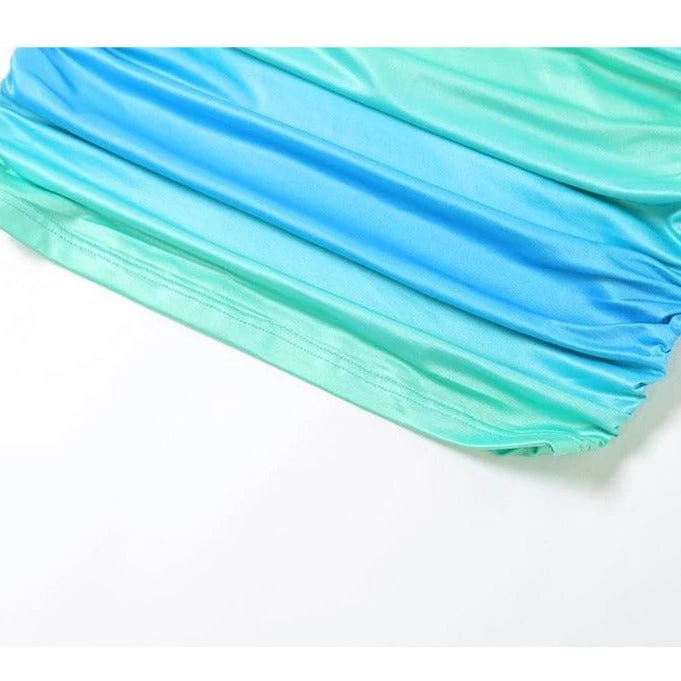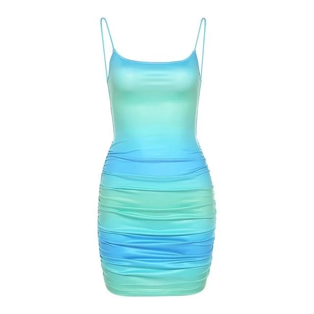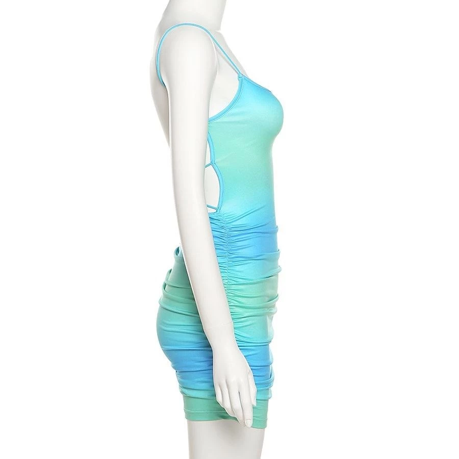 Blue and green tie dye-style striped mini dress with a criss cross back design.