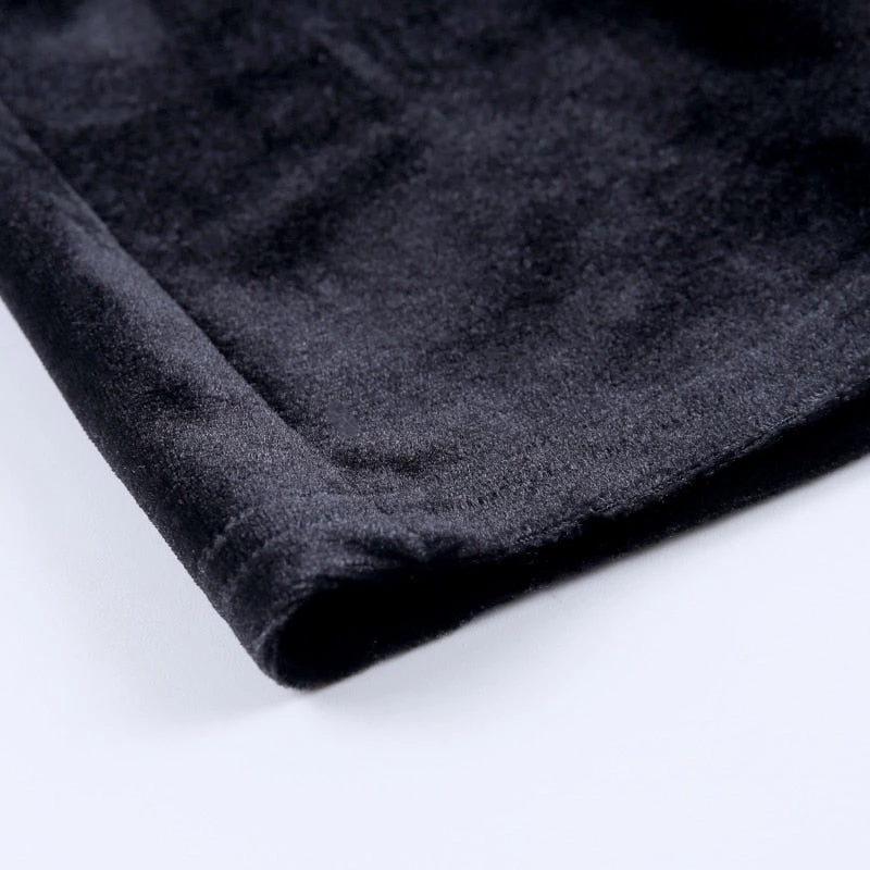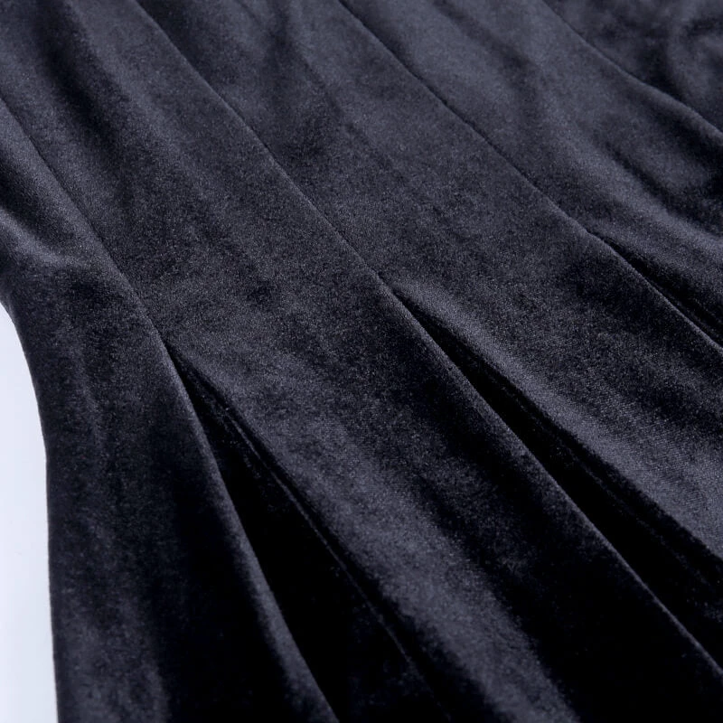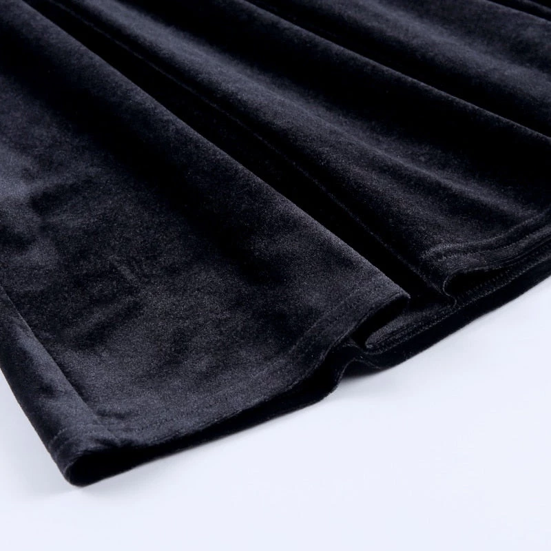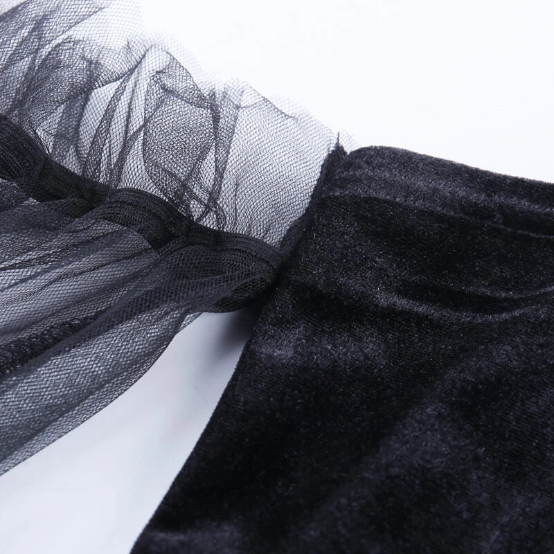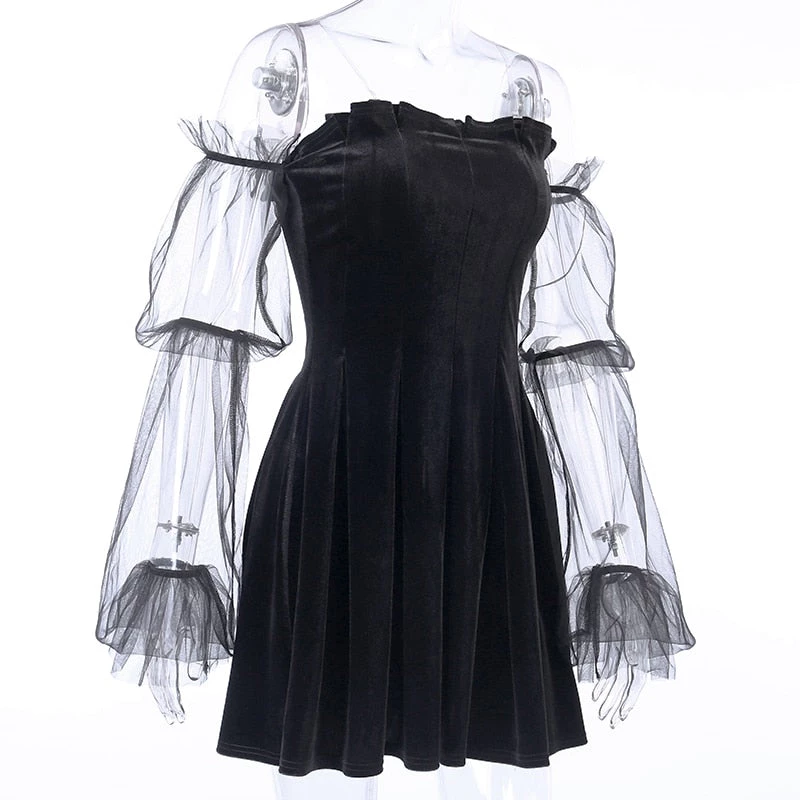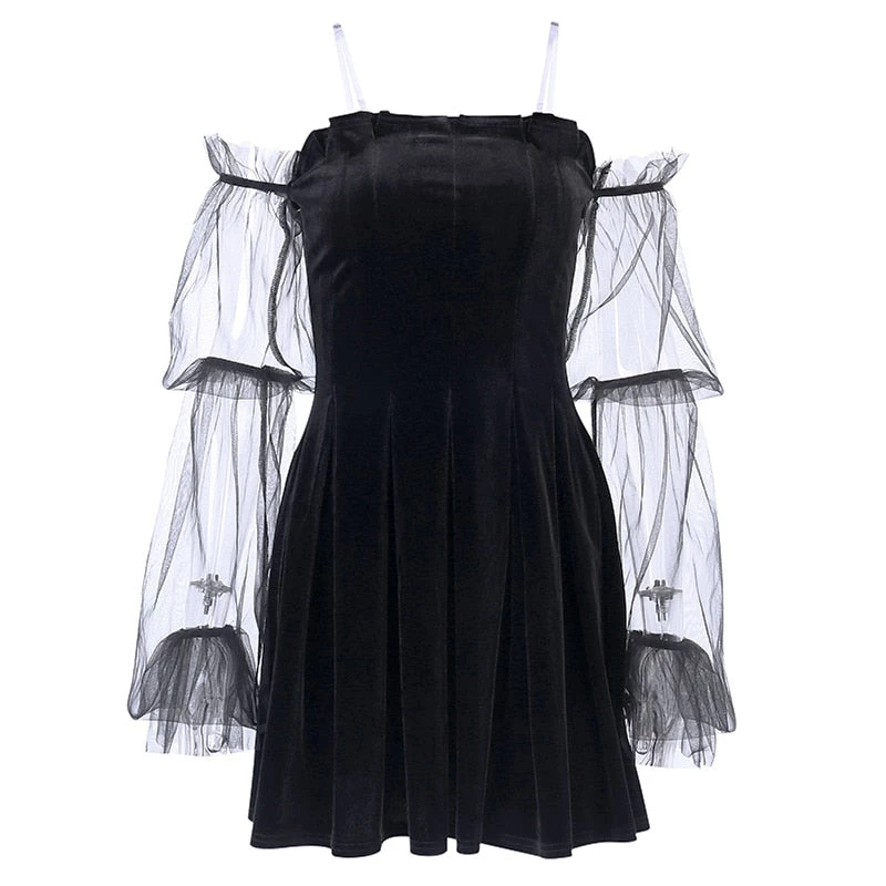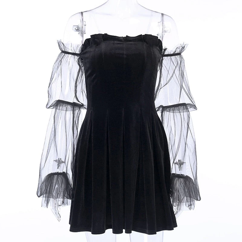 Black pleated velvet mini dress with see-through mesh sleeves.
