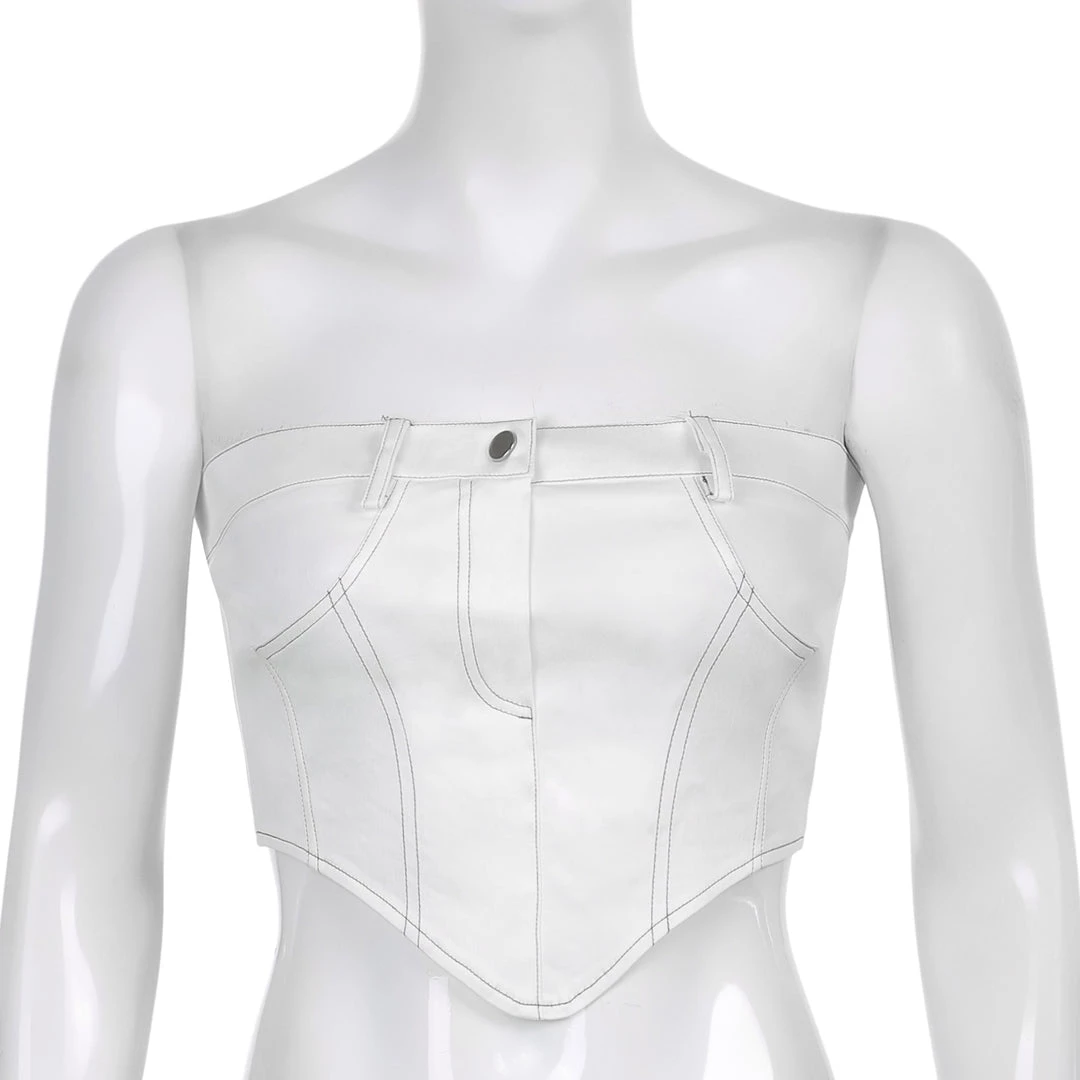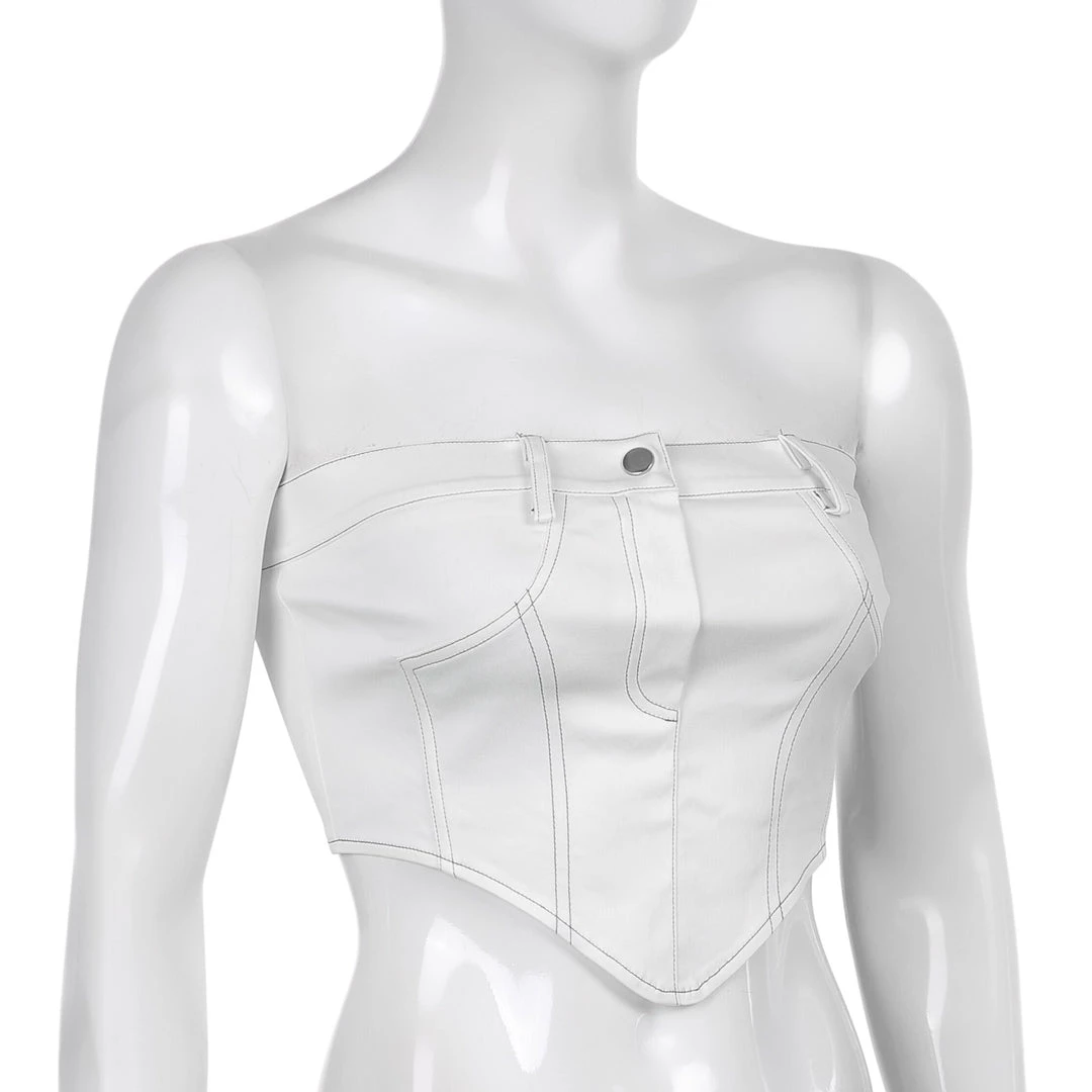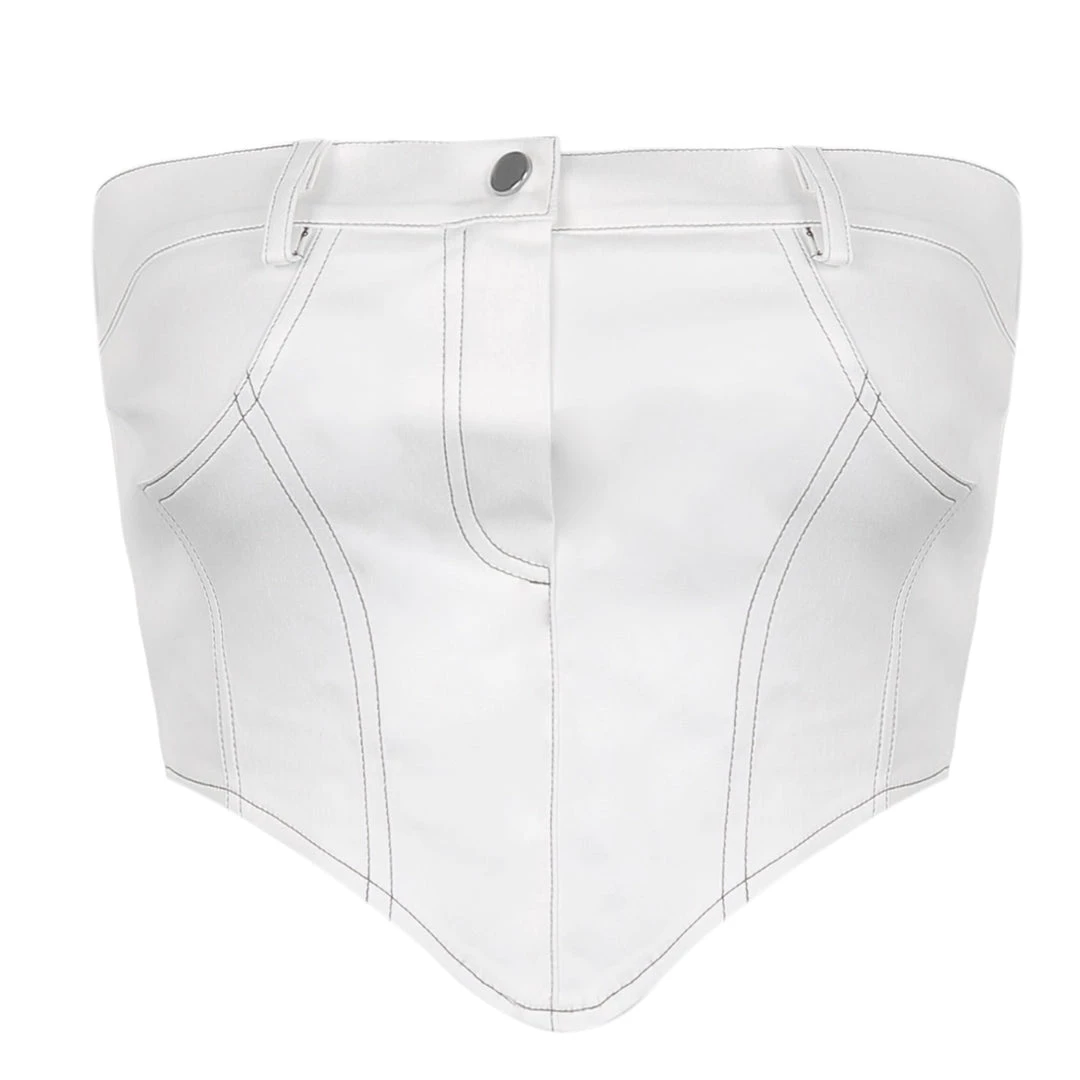 White jean-style bandeau pointed crop top.