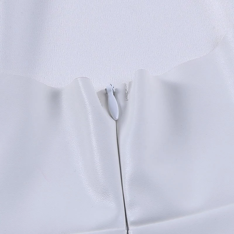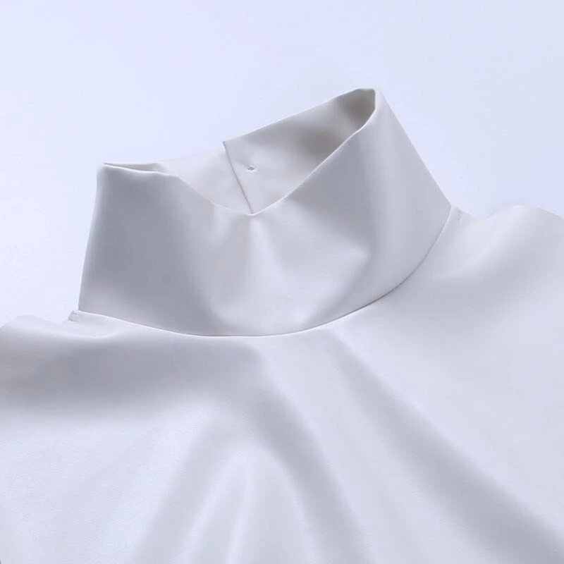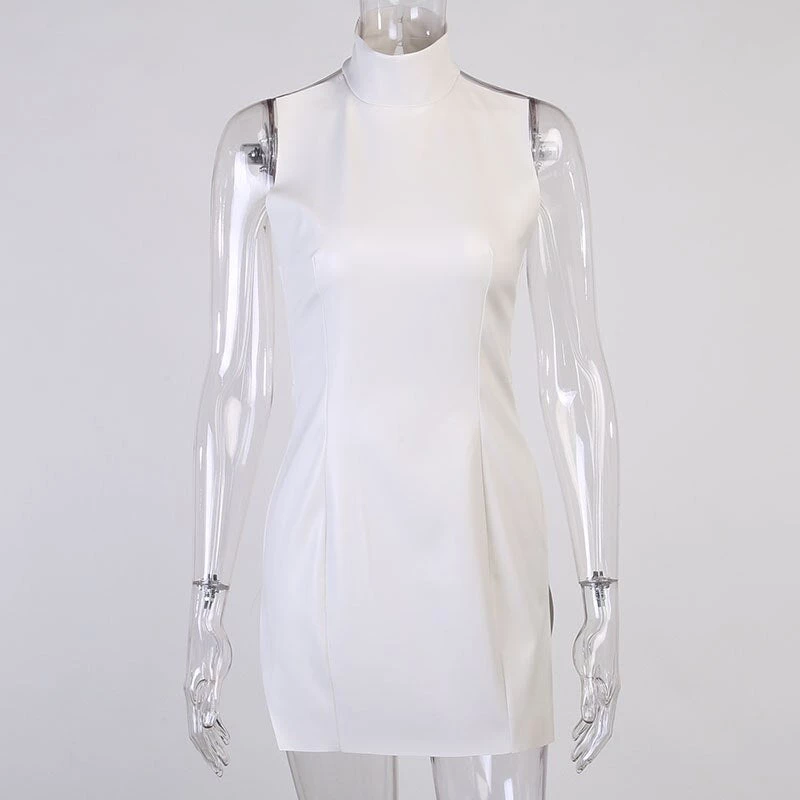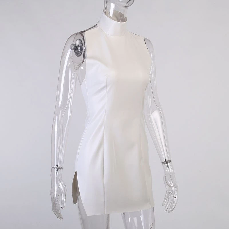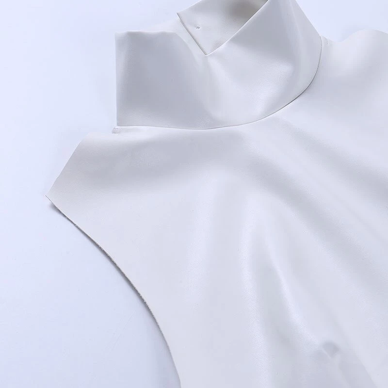 White turtleneck faux leather mini dress.