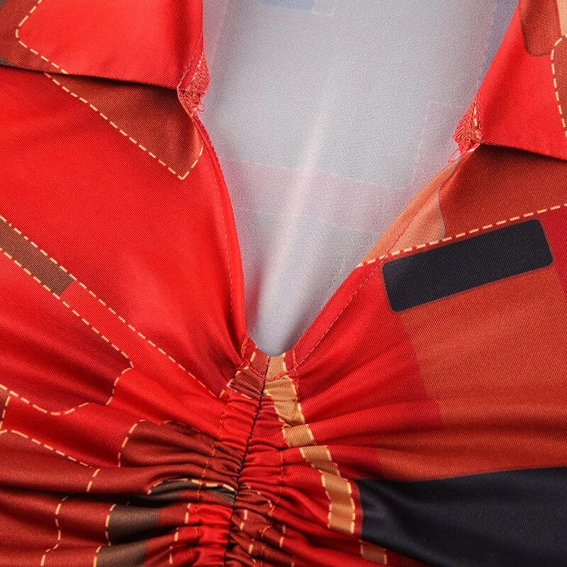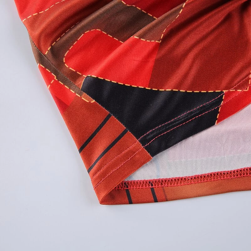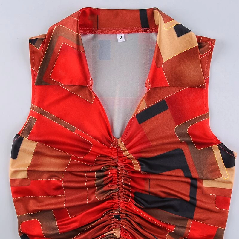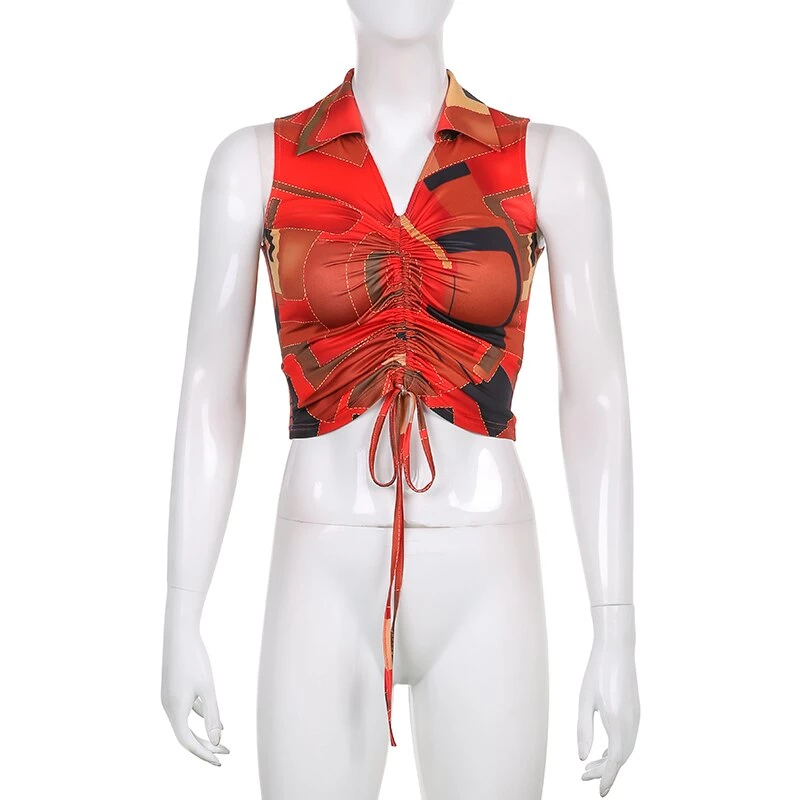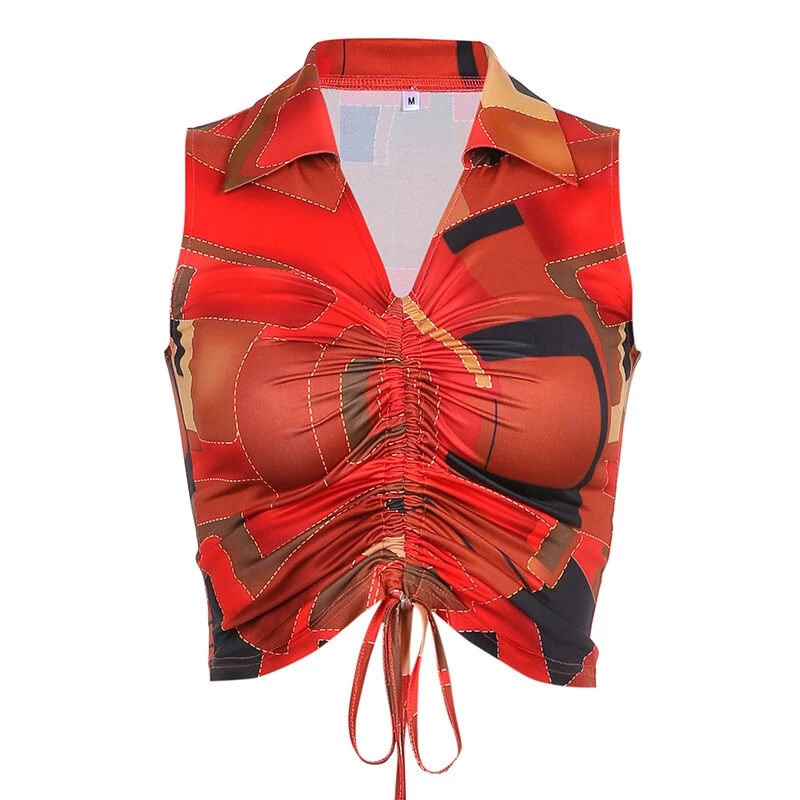 Red orange and black collared tank crop with a ruched centre.