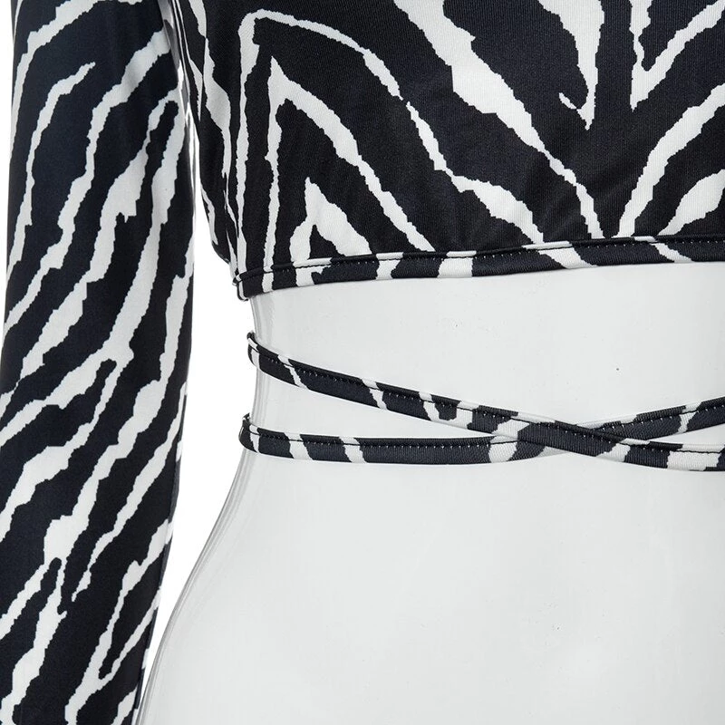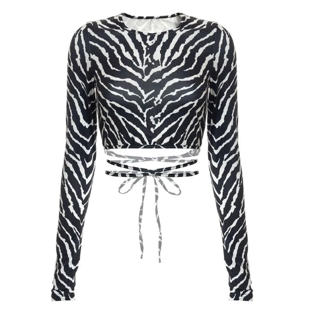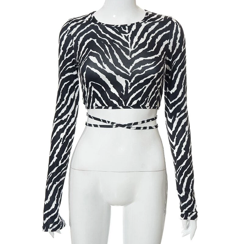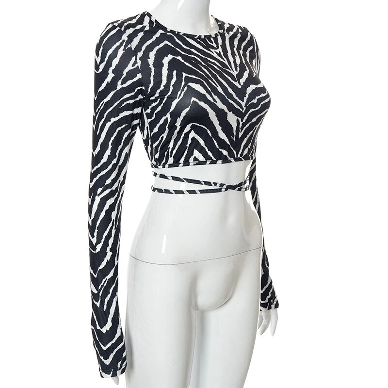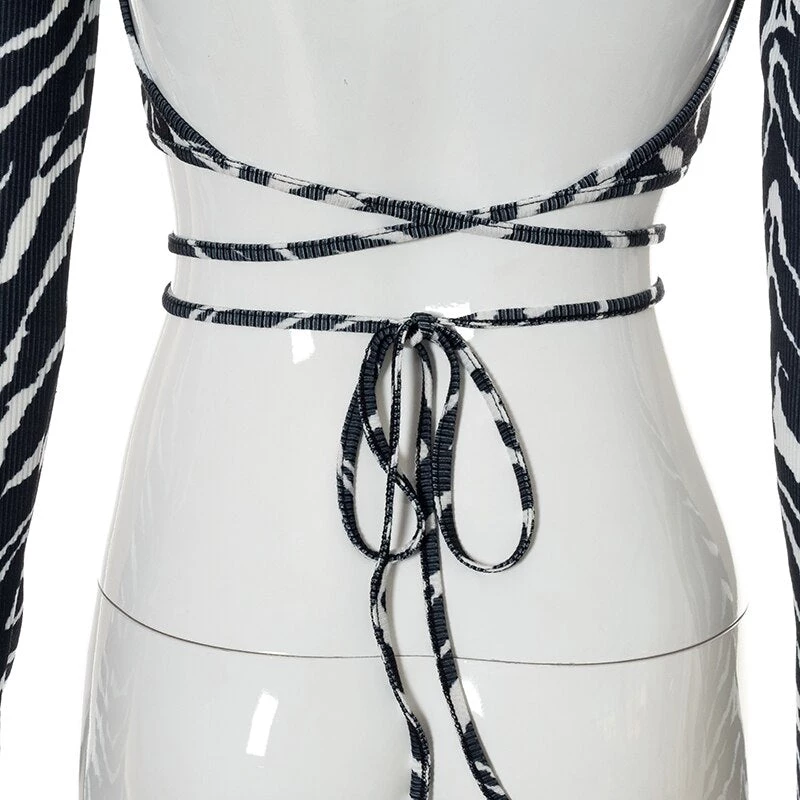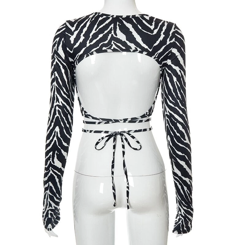 Black and white zebra print backless crop top with a tie up midsection and long sleeves.